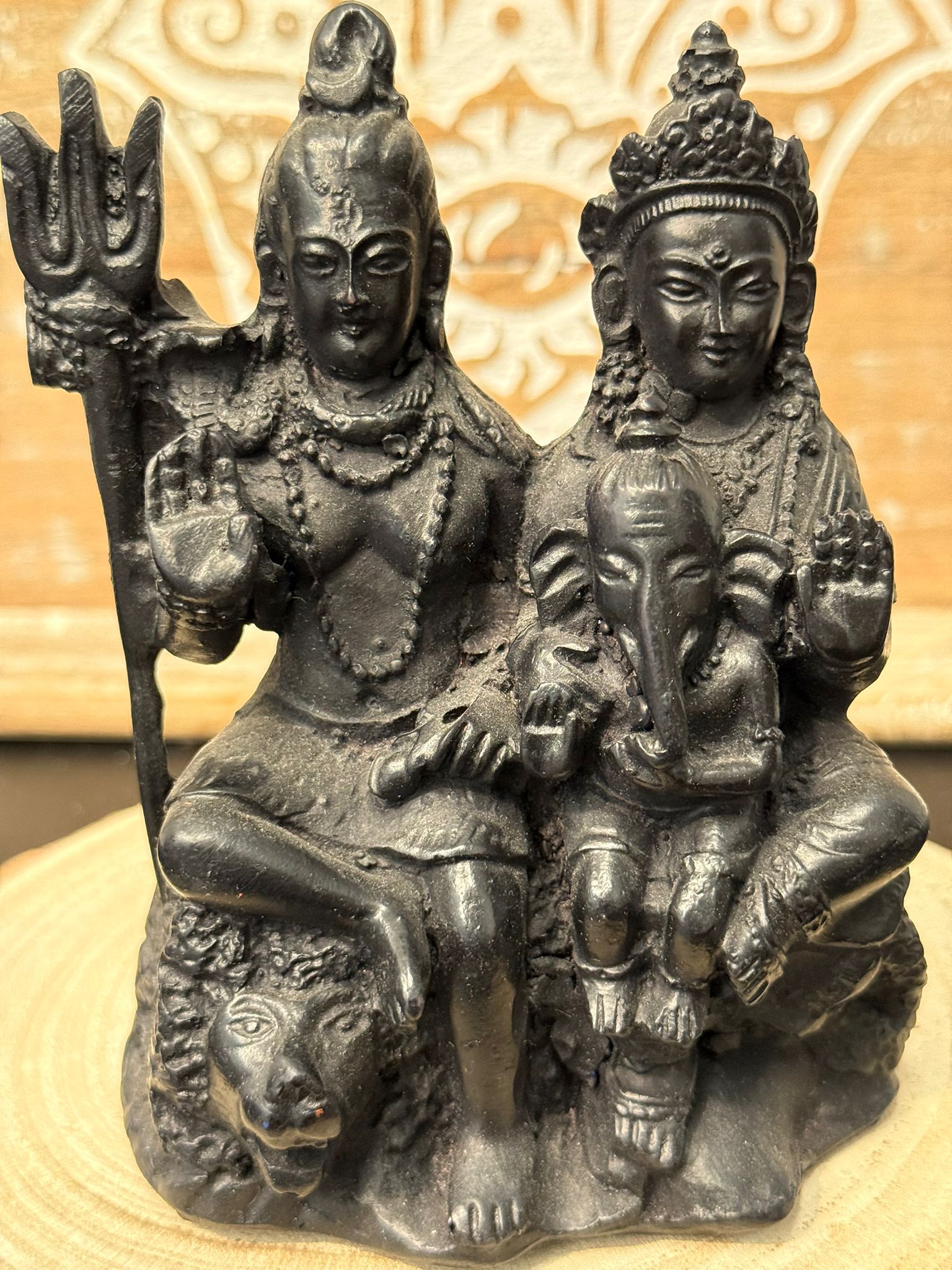 Ganesha es hijo de Shiva y Parvati y es hermano de Karthikeya (o Subrahmanya), el dios de la guerra. Fue creado por su madre con tierra que moldeó en forma de niño. Como Shiva estaba afuera, en sus andanzas meditativas, Parvati puso a su nuevo hijo como guardia mientras ella se bañaba.