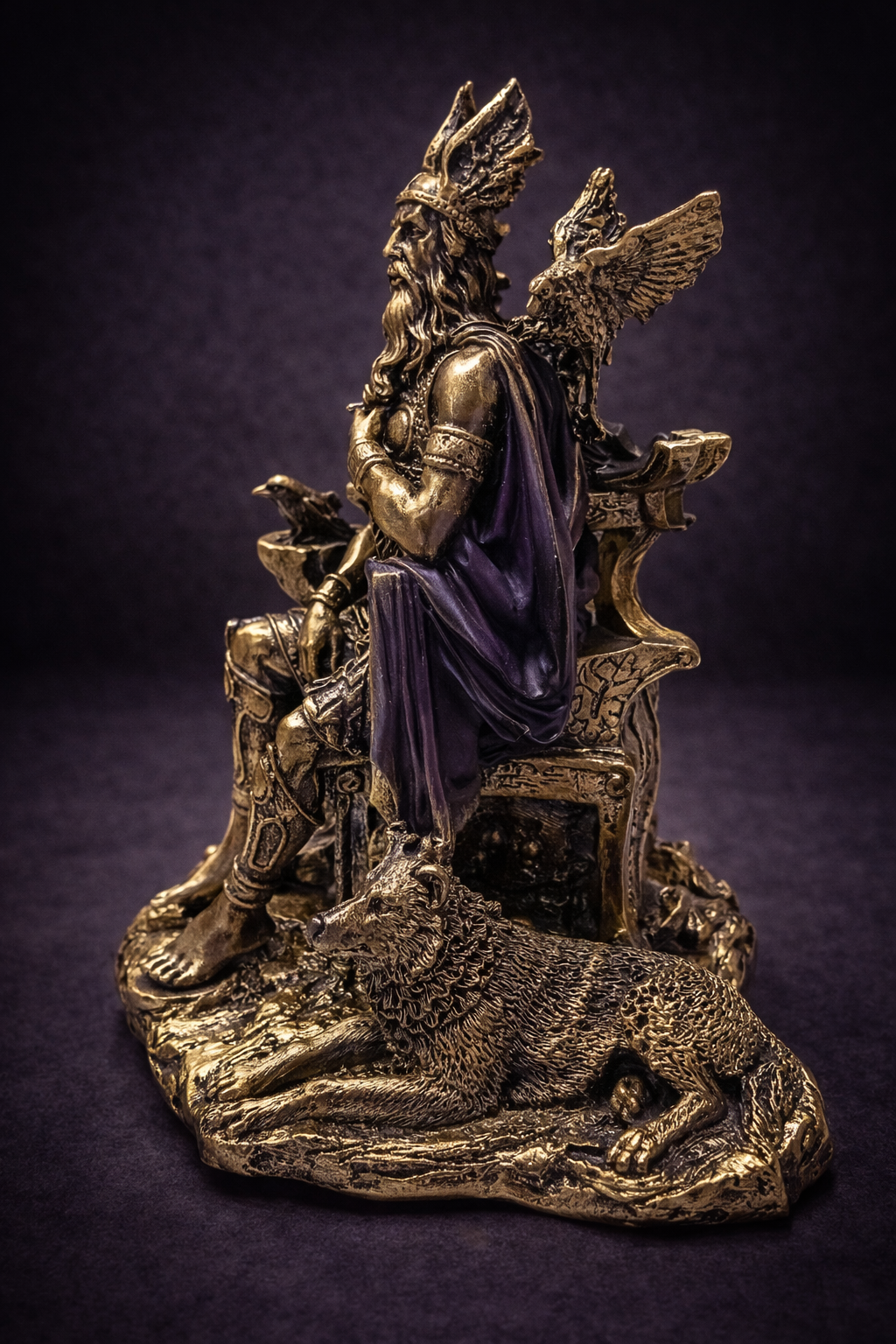 A sus pies reposan los lobos, guardianes de la fuerza instintiva y la lealtad espiritual, mientras los cuervos —mensajeros entre mundos— representan la mente y la memoria, la capacidad de ver más allá del velo y acceder a los secretos del universo. El trono simboliza la autoridad espiritual y el dominio de los nueve mundos.