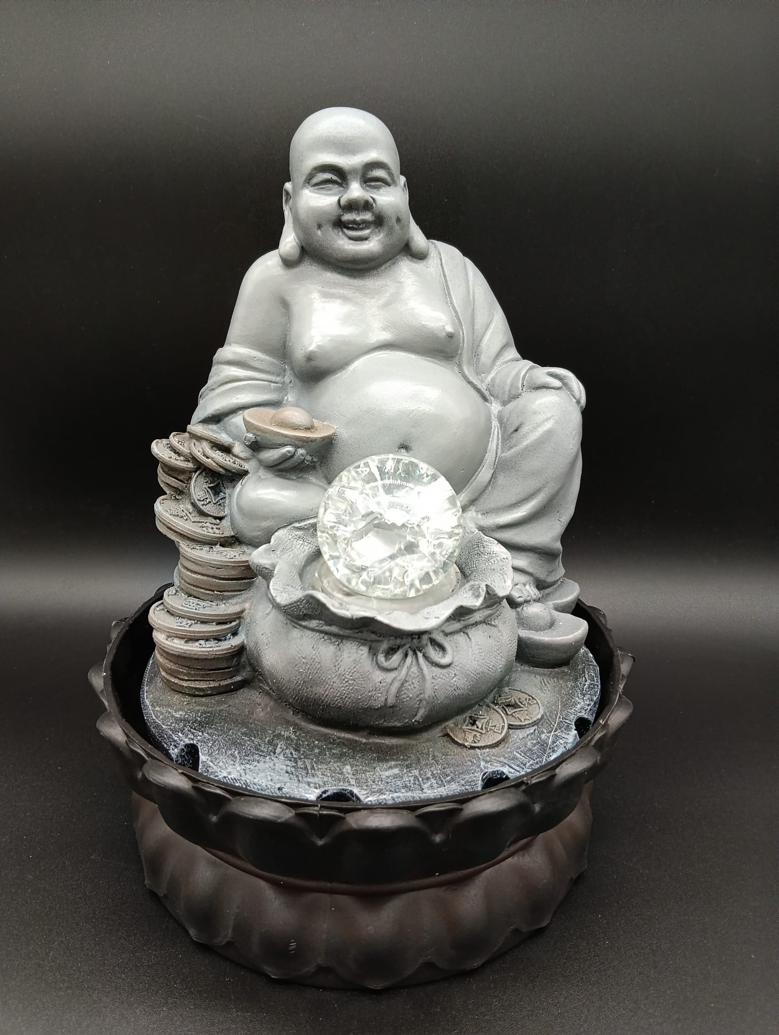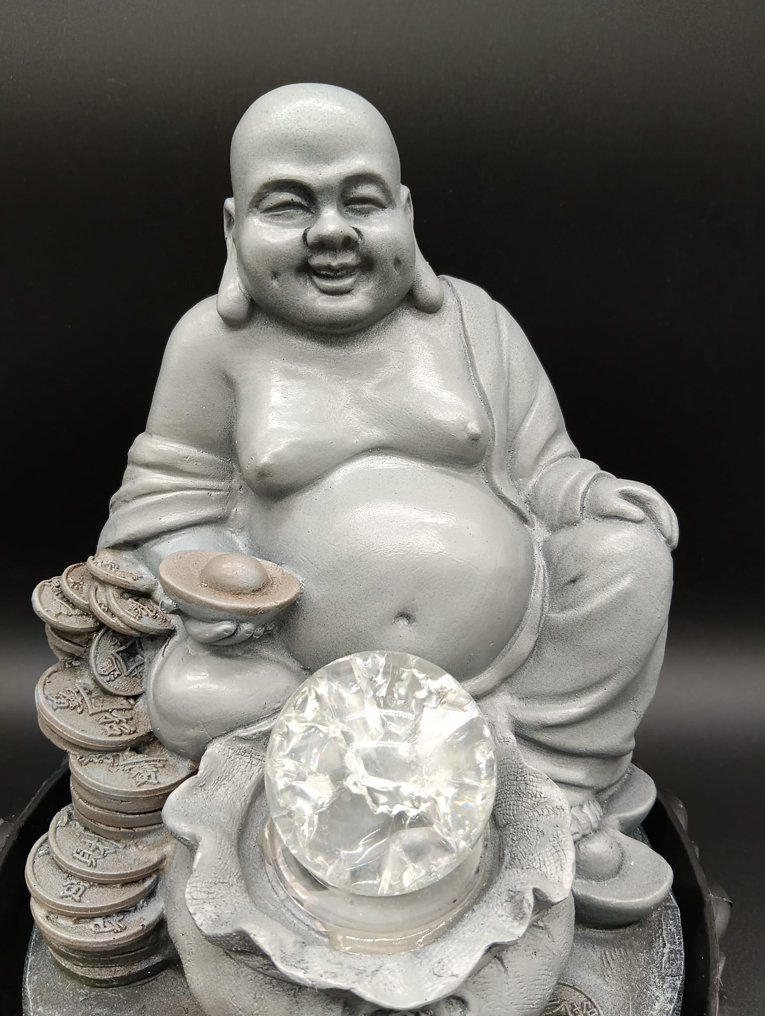 Fuente decorativa de resina gris con Buda y bola de cristal – 21 x 27 cm