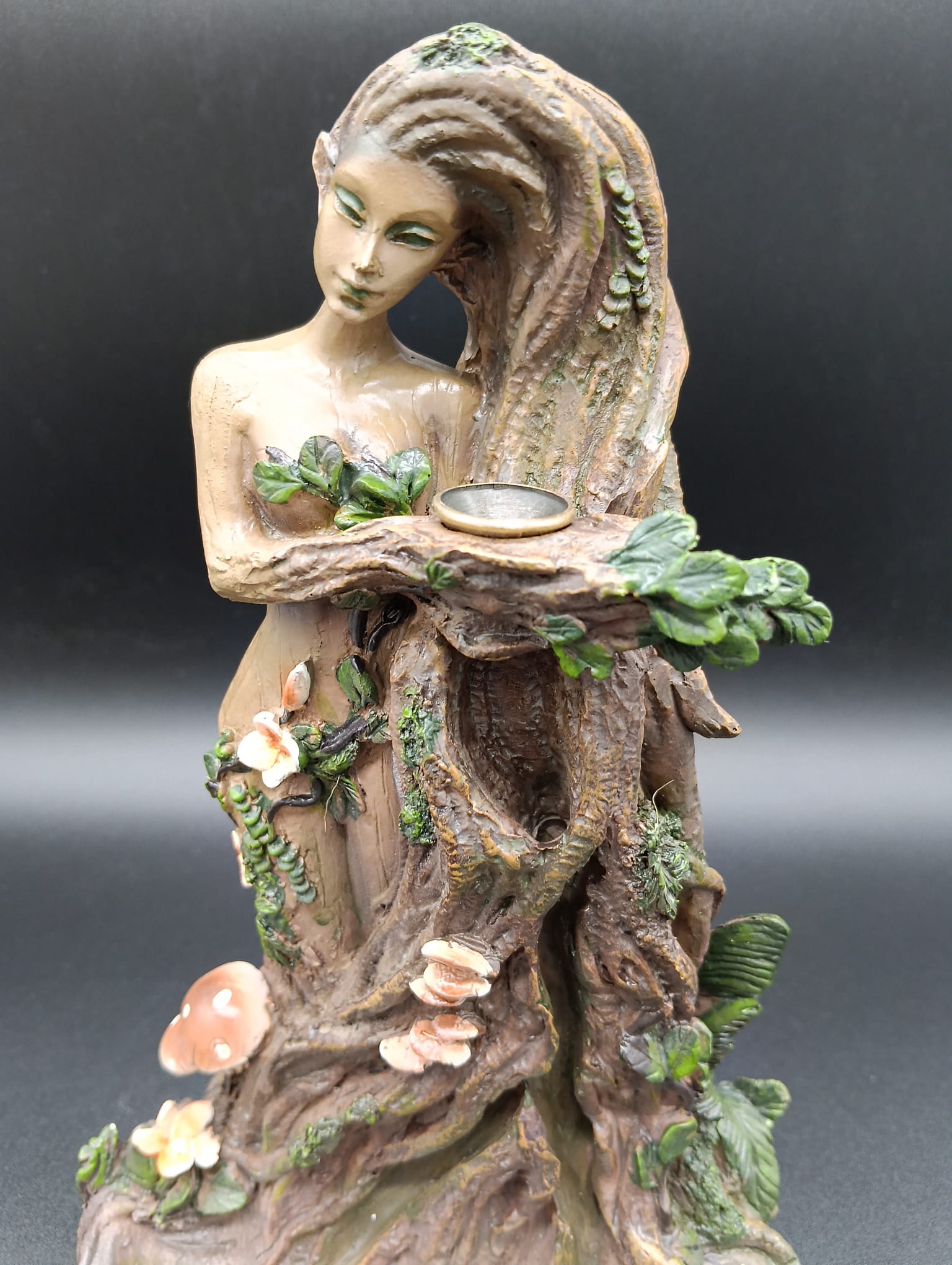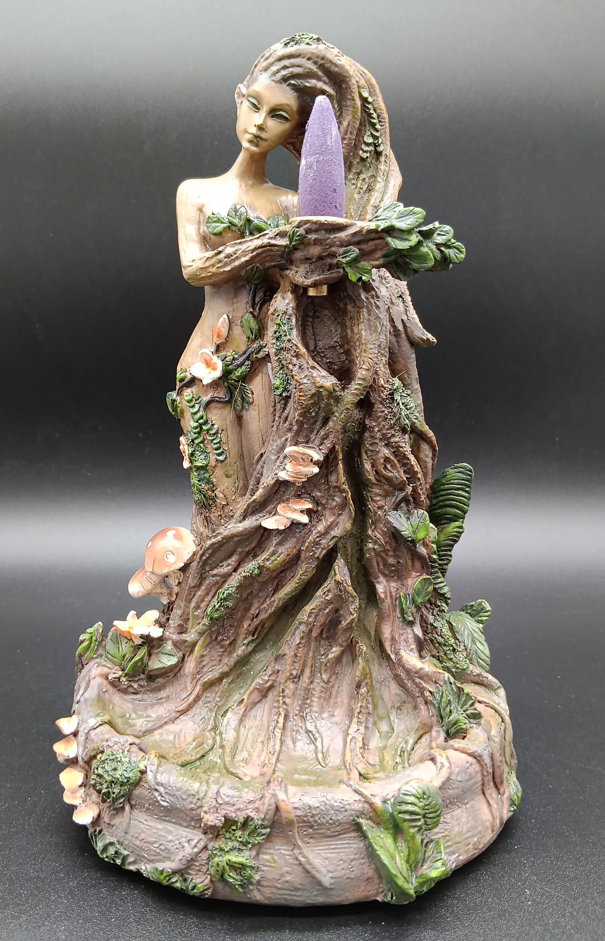 Esta fuente de reflujo en resina representa a la Madre Naturaleza como arquetipo de vida, creación y equilibrio universal. La figura emerge de un tronco ancestral, rodeada de raíces, hojas, hongos y elementos vegetales que simbolizan la fuerza vital de la Tierra y la interconexión de todos los seres.