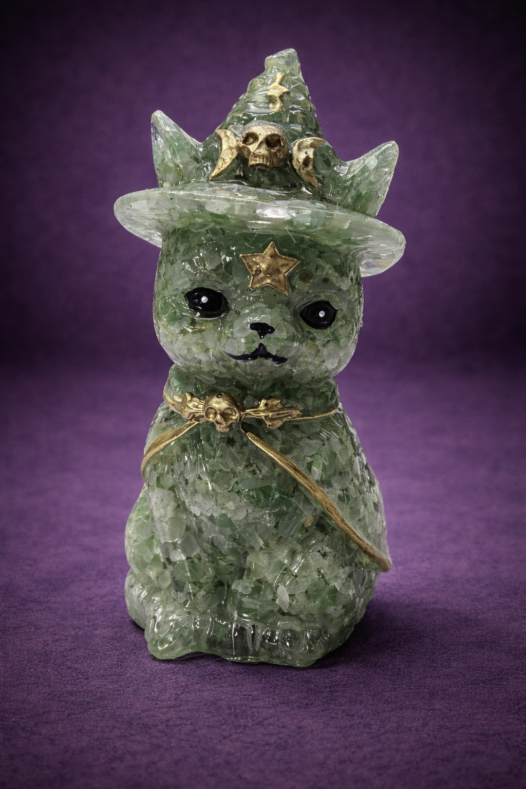 Gatito esotérico con sombrero elaborado en orgonita con aventurina verde, una pieza que combina dulzura, protección y energía de prosperidad.