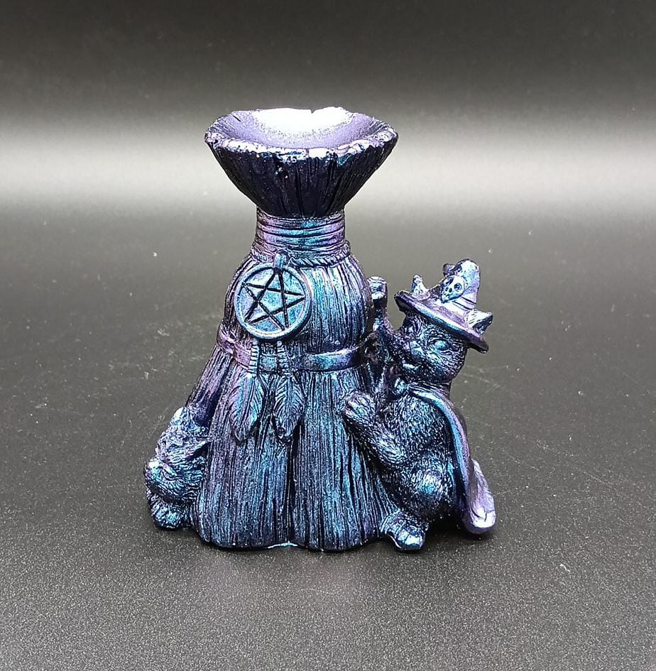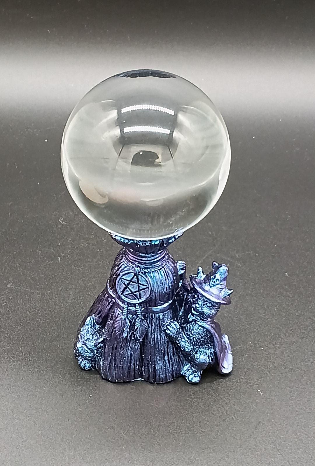 Soporte esotérico para bola de cristal – Gato místico con escoba y pentagrama morado