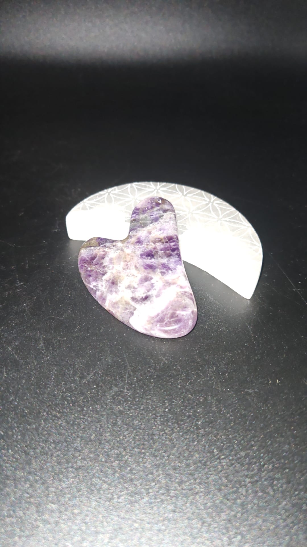 Nota: Al ser una pieza natural, el tono y las vetas de la amatista pueden variar ligeramente, haciendo de cada gua sha una pieza única con su propia energía.