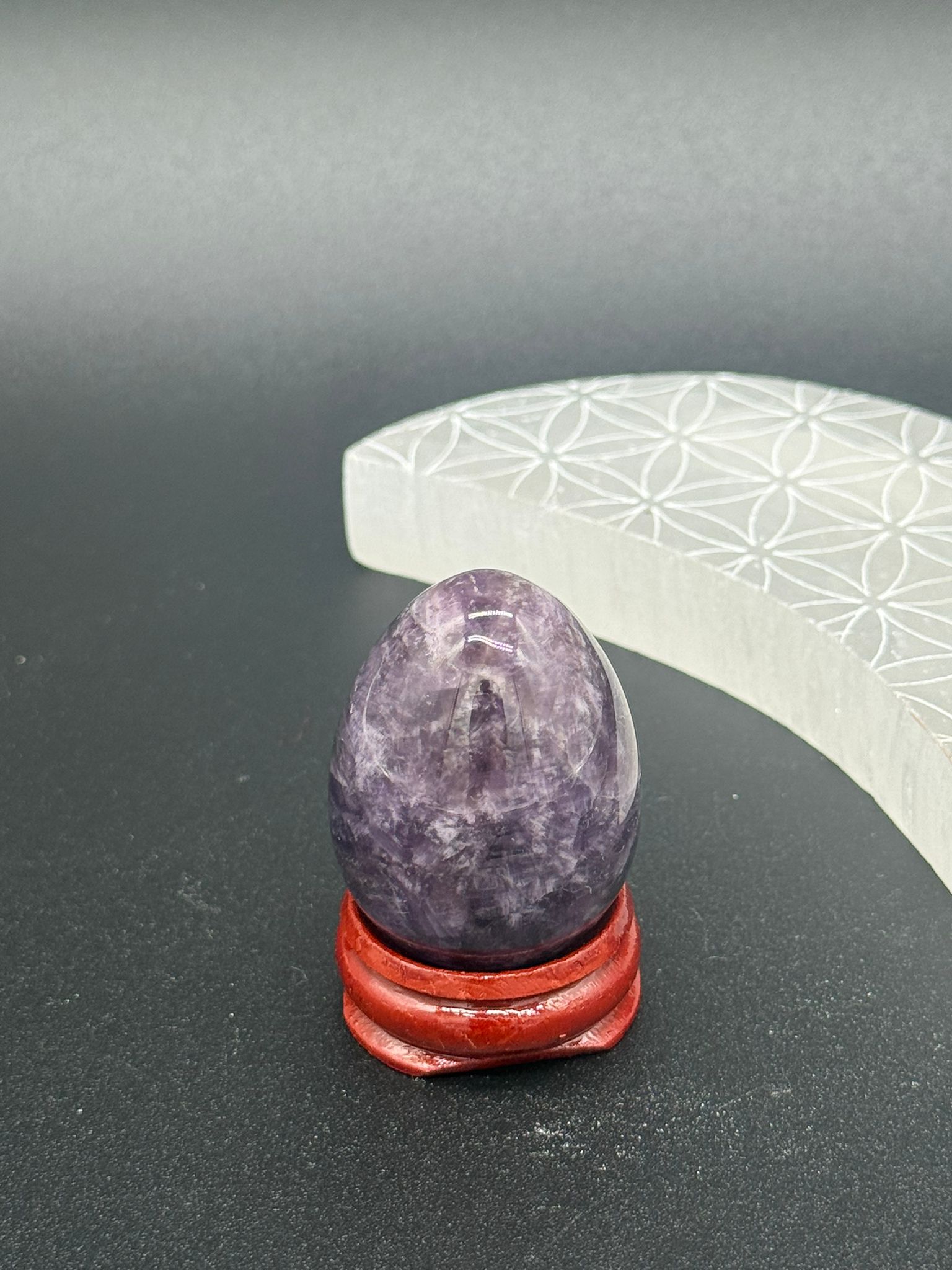 Este delicado huevo de amatista, de aproximadamente 4 cm de alto, es una pieza profundamente vinculada con la paz interior, la protección energética y la expansión espiritual. Su forma ovalada, símbolo de renacimiento y transformación, potencia la vibración elevada de la amatista, permitiendo que su energía actúe de forma envolvente y armonizadora.
