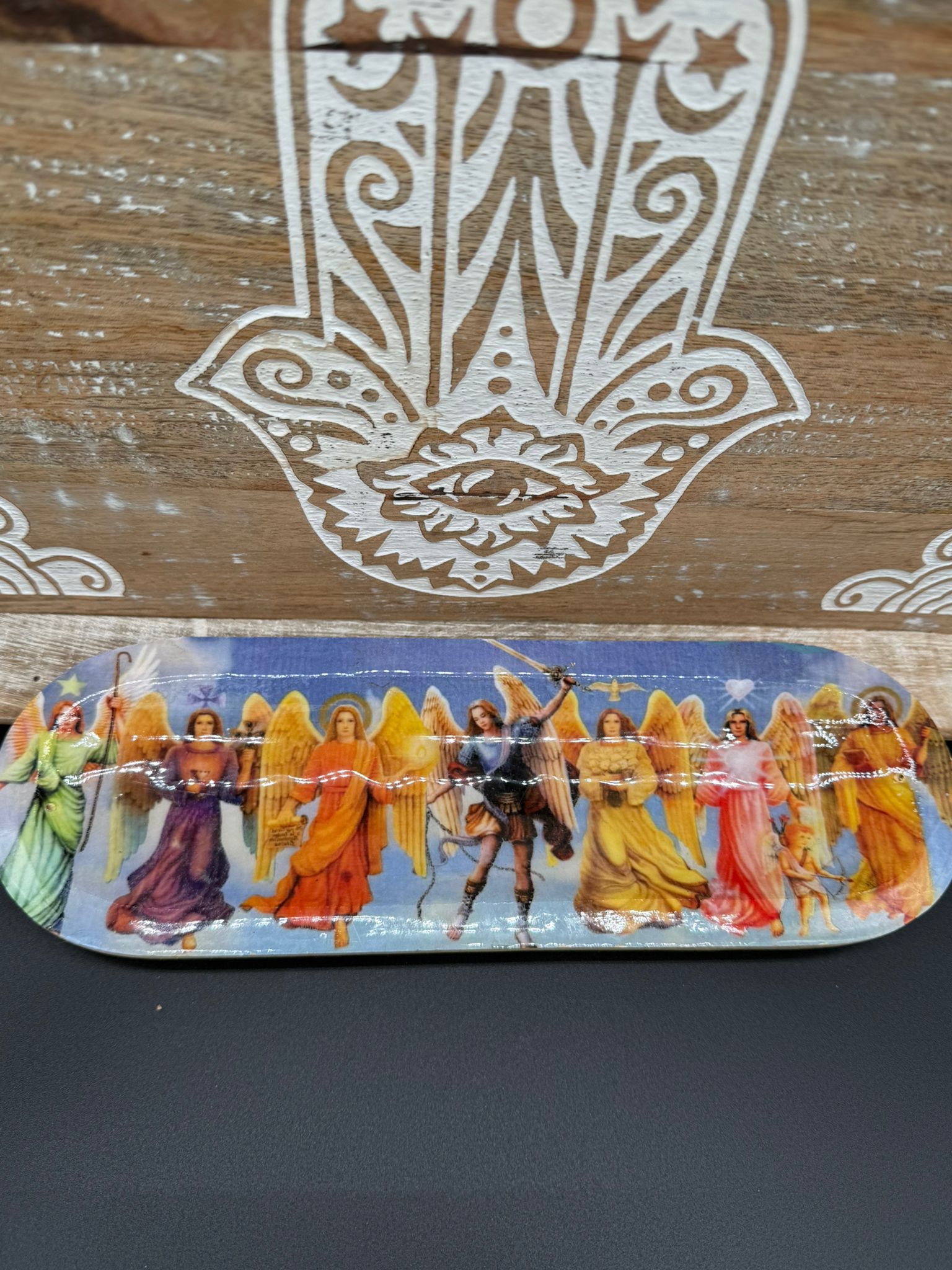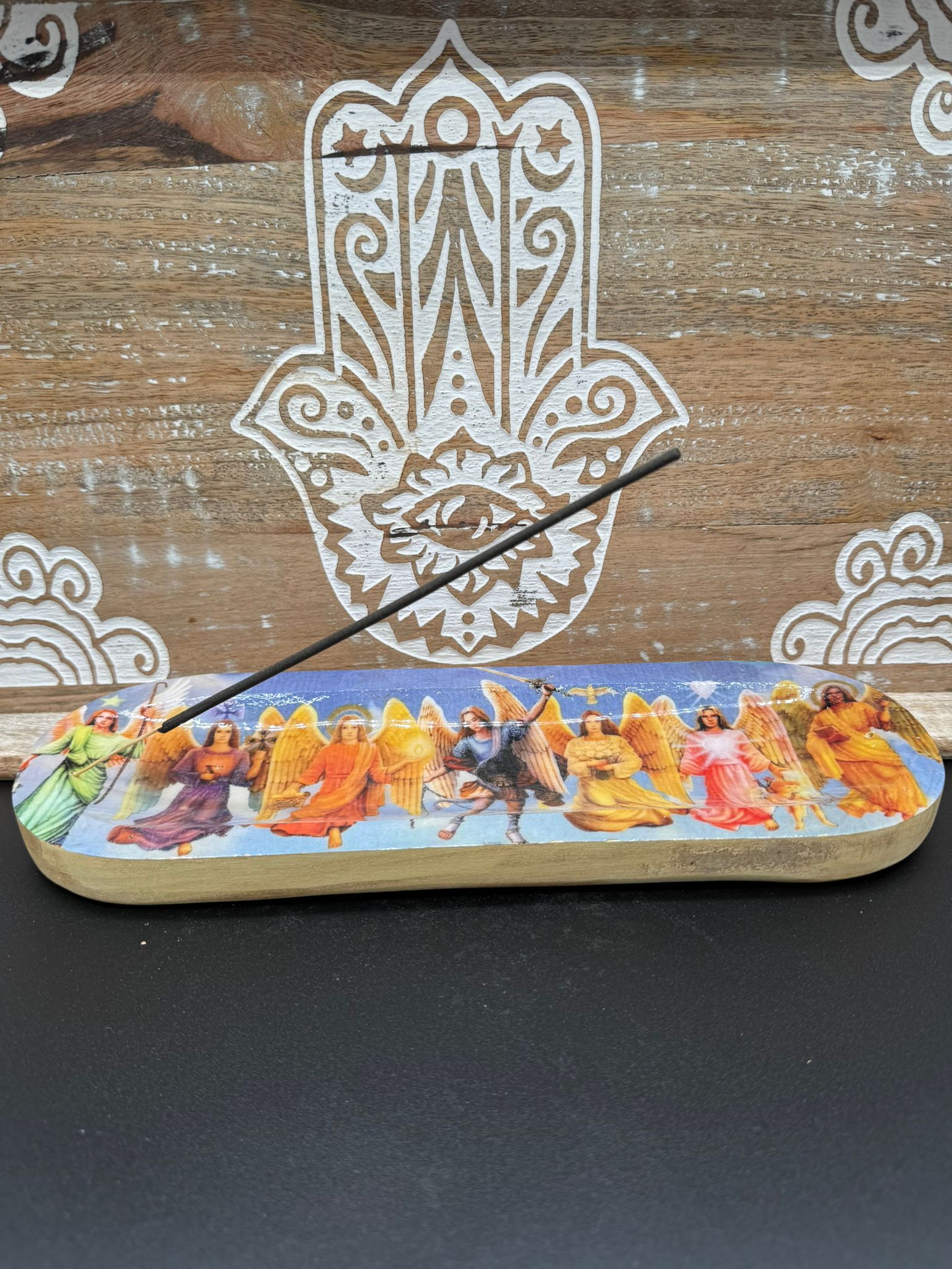 Este majestuoso incensario de madera de aproximadamente 30 x 9.5 cm es mucho más que un soporte para incienso: es un canal sagrado que invoca la presencia y guía de los 7 Arcángeles, seres de luz que actúan como mensajeros, protectores y sanadores espirituales.