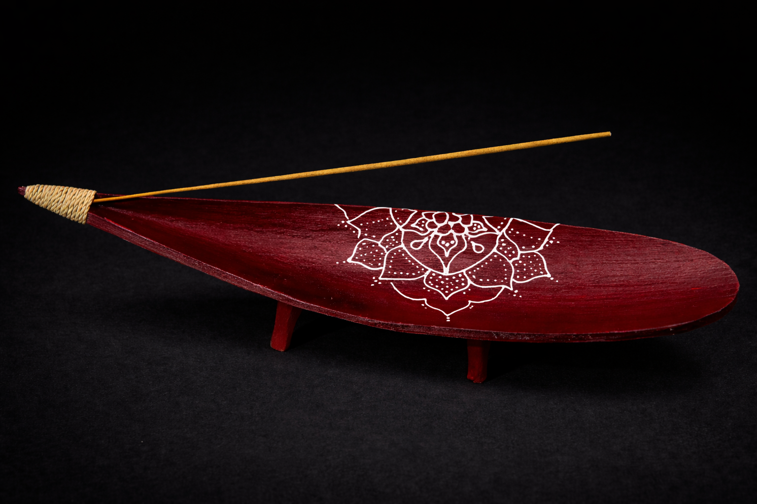 Elegante incensario artesanal elaborado en madera con forma de hoja de coco, un símbolo asociado a la naturaleza, la renovación y la energía vital. Su diseño alargado y estilizado permite sostener varillas de incienso de forma cómoda mientras recoge la ceniza, manteniendo el espacio limpio durante la quema.