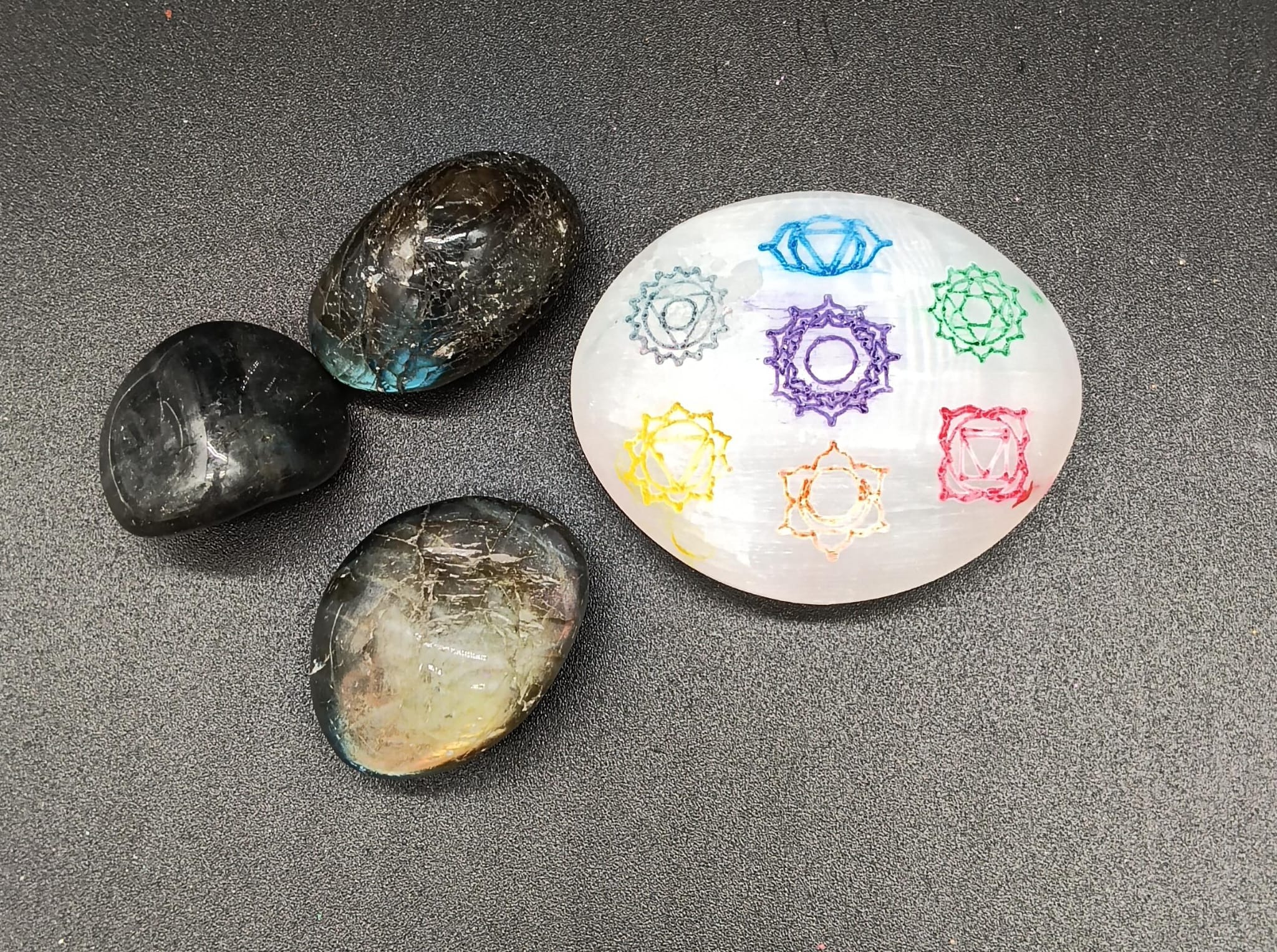 Esta pieza de selenita, esculpida en forma de jabón y decorada con los símbolos de los 7 chakras, es una herramienta poderosa para la limpieza energética, la armonización de los centros de energía y la elevación espiritual. Cada chakra, representando un aspecto específico del cuerpo y la mente, se activa y equilibra a través de la energía vibratoria de la selenita, promoviendo bienestar físico, emocional y espiritual.