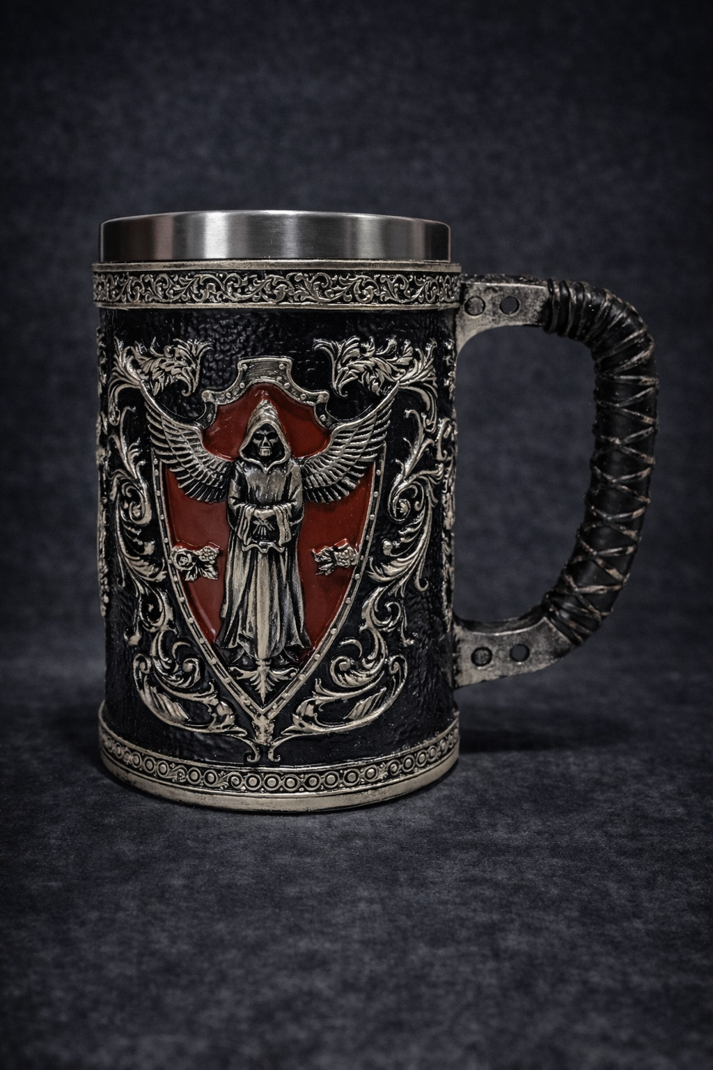Elegante jarra decorativa inspirada en la Santa Muerte, representada en relieve con alas extendidas y guadaña, símbolo de protección, justicia y poder espiritual. La figura central se encuentra enmarcada en un escudo rojo que intensifica su presencia y aporta un fuerte impacto visual.