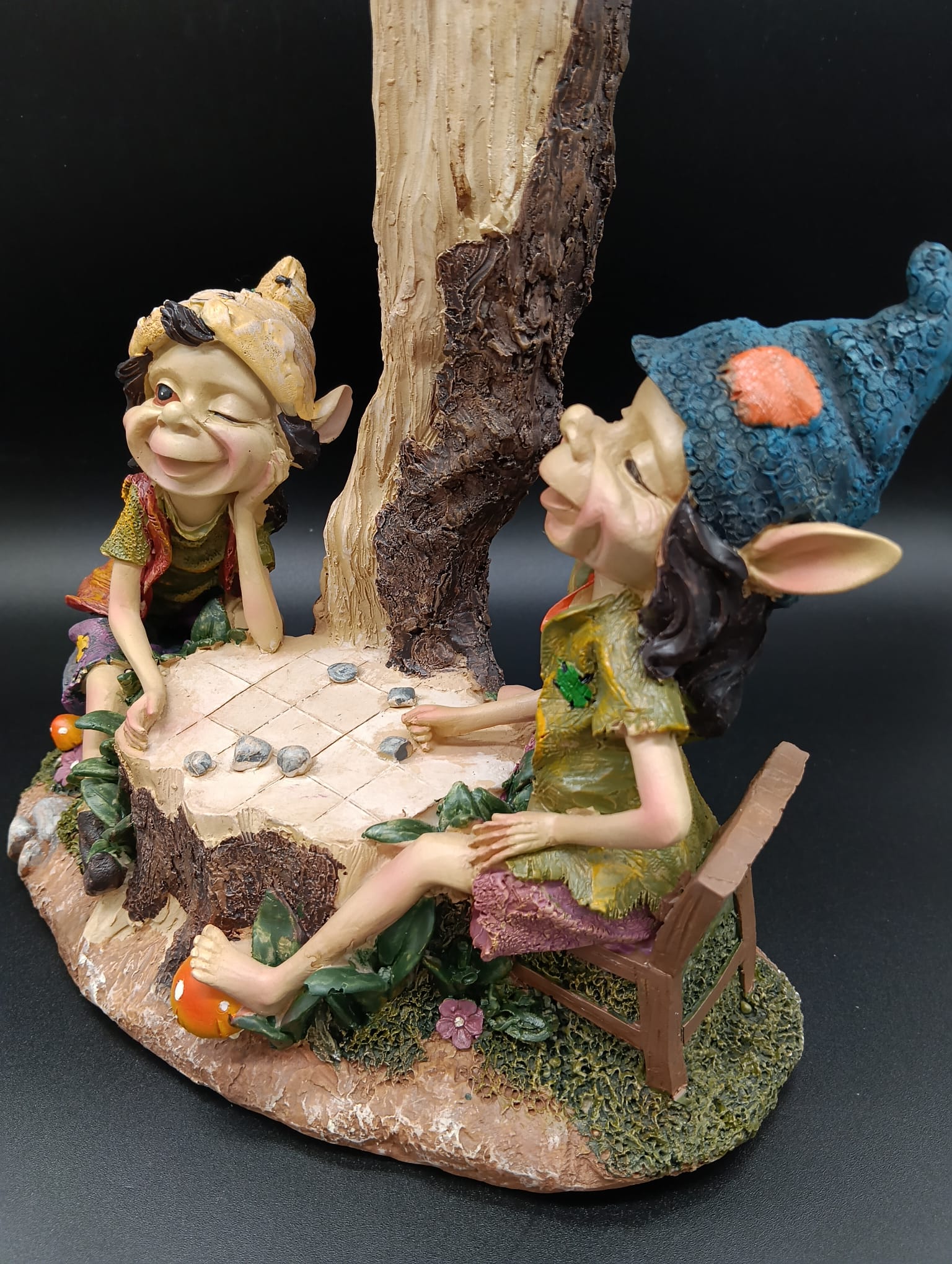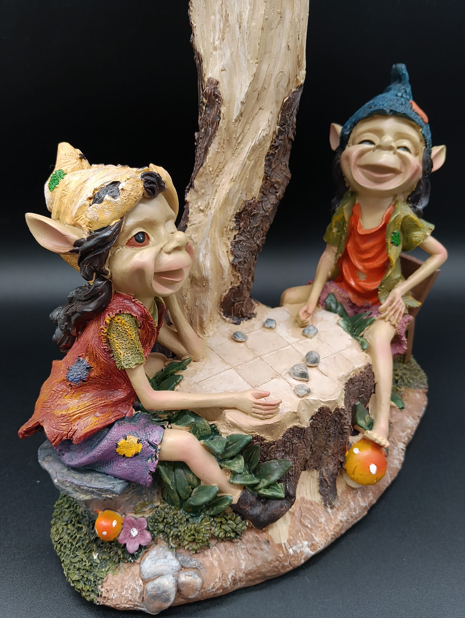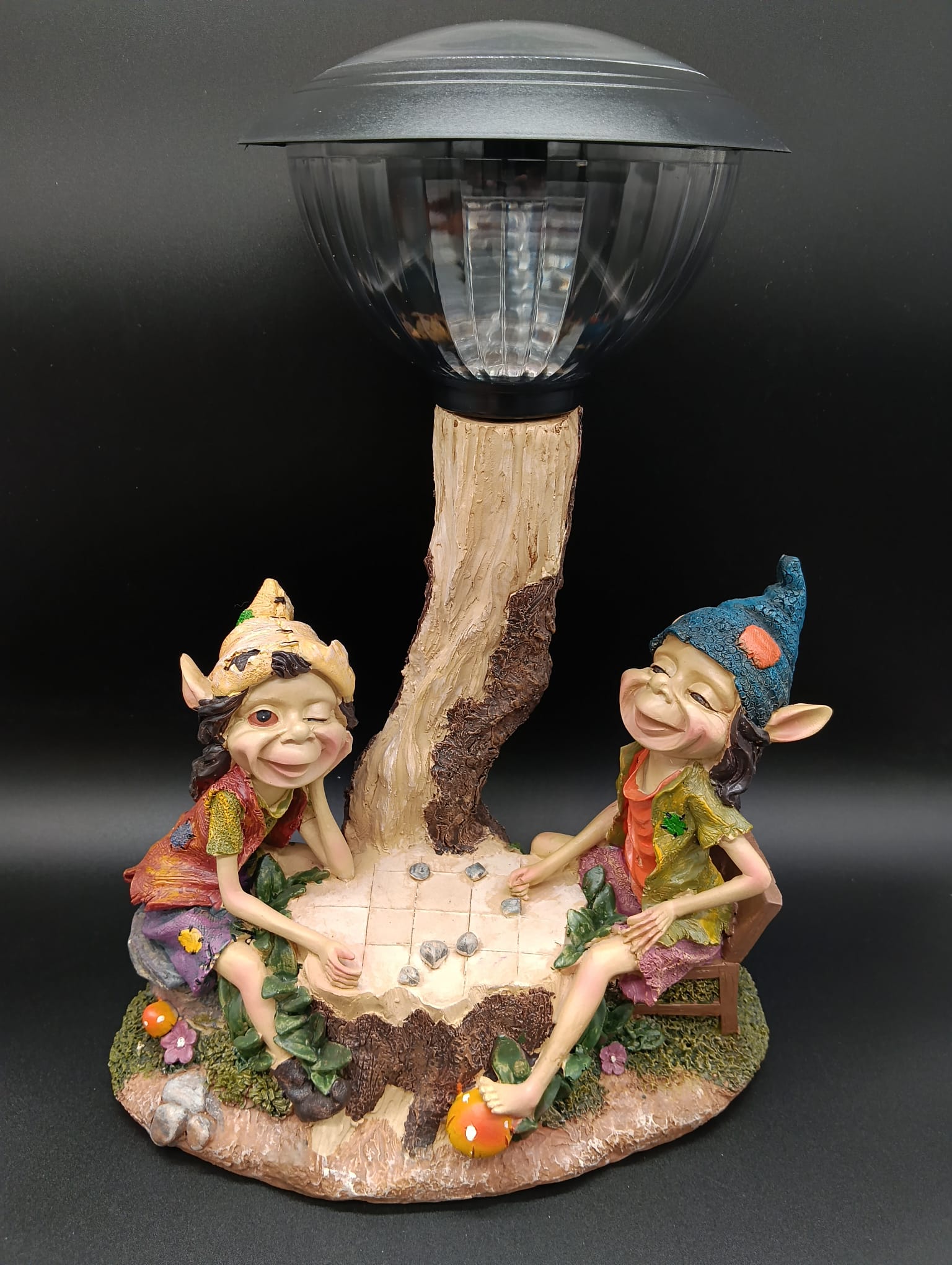 Esta lámpara solar decorativa representa a dos duendes guardianes reunidos alrededor de un tronco sagrado, símbolo ancestral de la conexión con la naturaleza, la estabilidad y la sabiduría de la Tierra. Los duendes, seres elementales vinculados al reino natural, son conocidos en la tradición esotérica como protectores de los espacios, portadores de alegría y armonizadores energéticos.