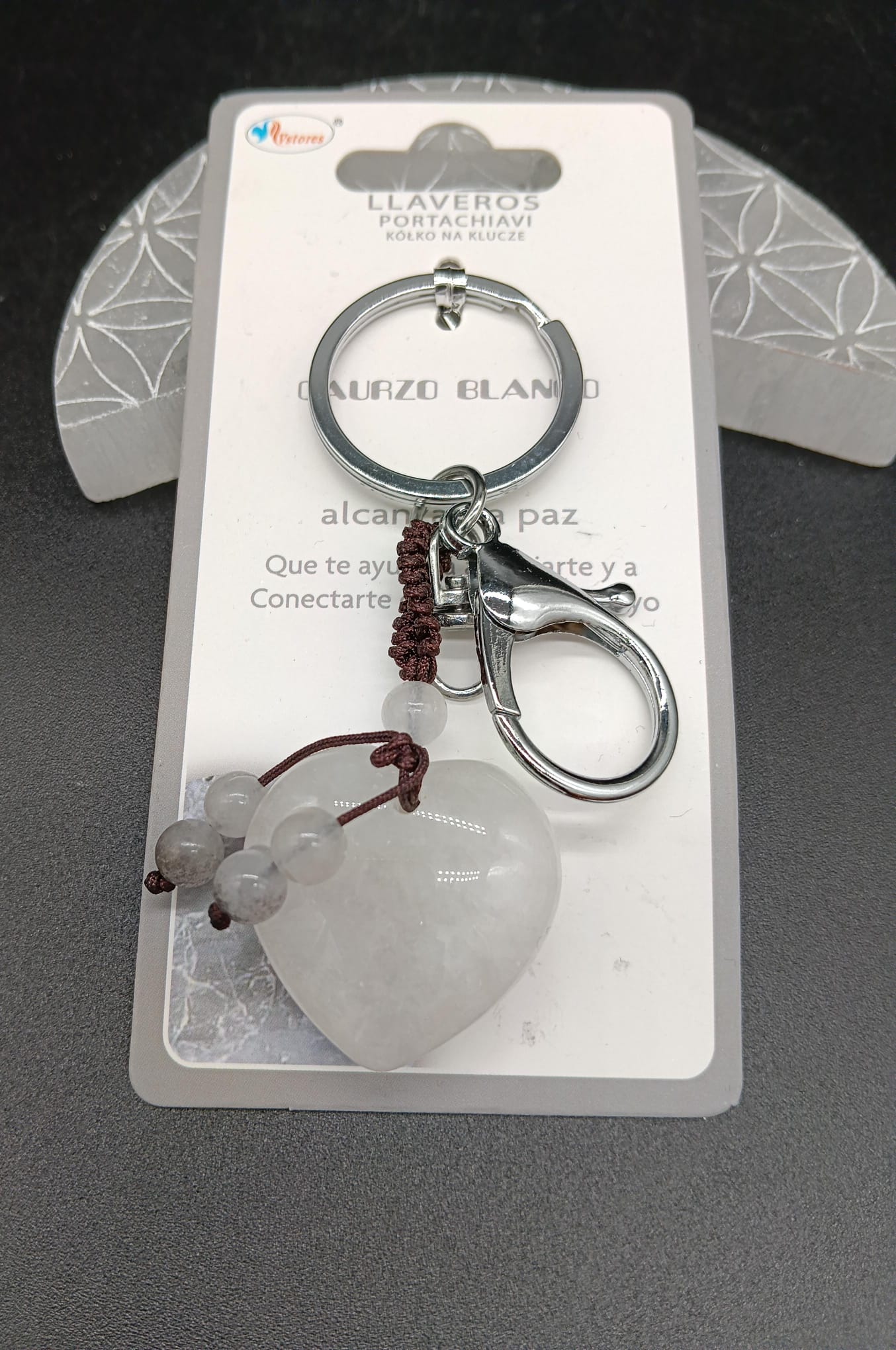 Llavero elaborado con cuarzo blanco natural tallado en forma de corazón, montado sobre un resistente enganche metálico para llaves o bolsos. El cuarzo blanco destaca por su transparencia y pureza, convirtiendo este llavero en una pieza sencilla, elegante y con un profundo significado simbólico.