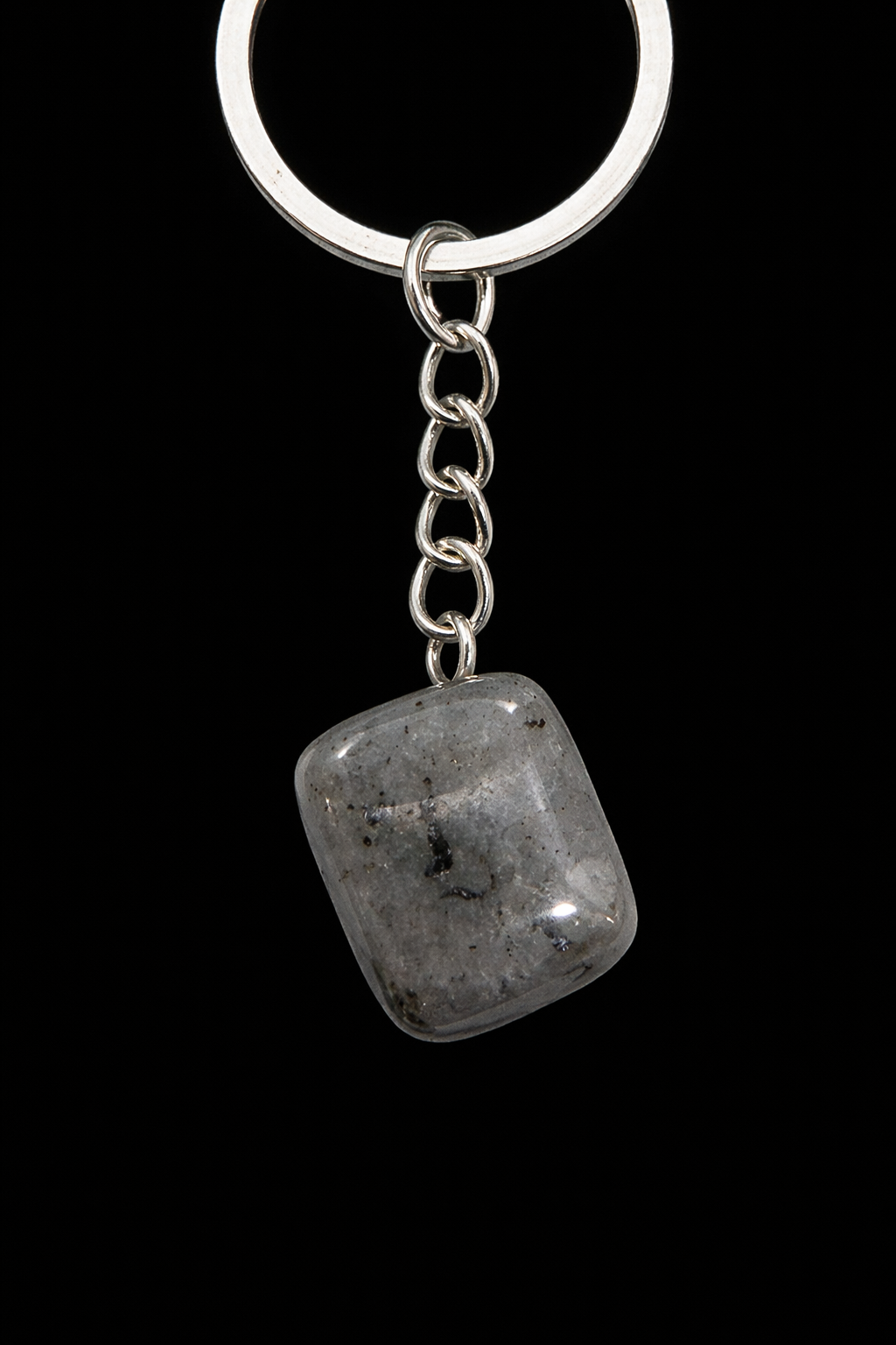 Llavero elaborado con labradorita natural pulida, un mineral de tonos grisáceos con inclusiones oscuras que, según la pieza, puede presentar sutiles reflejos iridiscentes característicos de esta piedra. Cada llavero es único debido a las variaciones naturales propias del mineral.