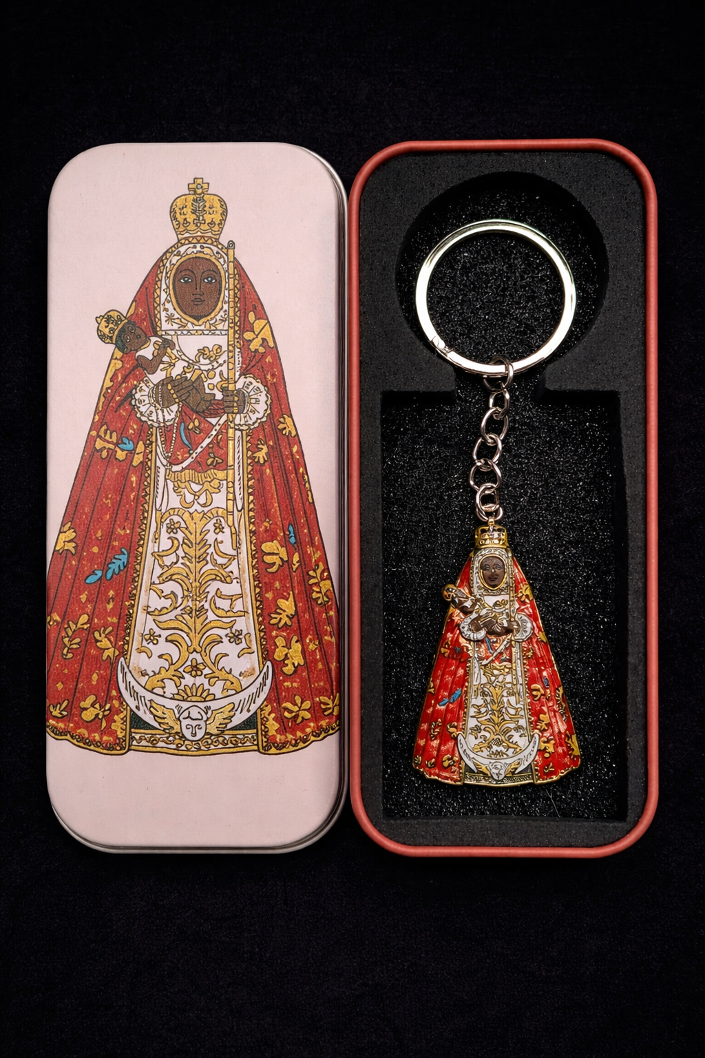 Llavero Virgen de la Candelaria presentado en estuche metálico ilustrado a juego. Una pieza religiosa cuidada al detalle que combina devoción y elegancia en un formato práctico para llevar siempre contigo.
