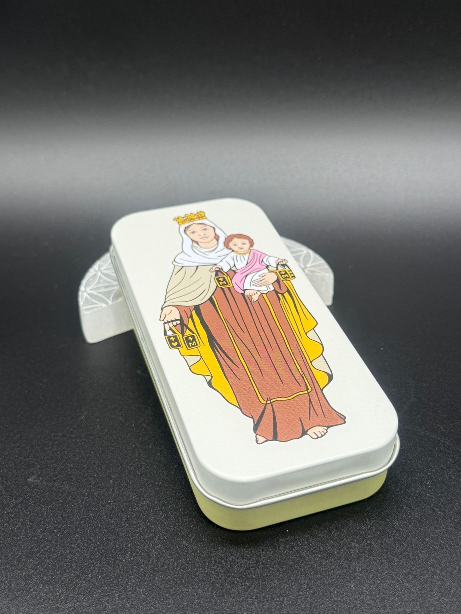 Este llavero presenta la imagen de la Virgen del Carmen, patrona del mar, los conductores y de las almas del purgatorio. Es un símbolo de fe profunda, consuelo espiritual y protección constante para quienes confían en su intercesión.
