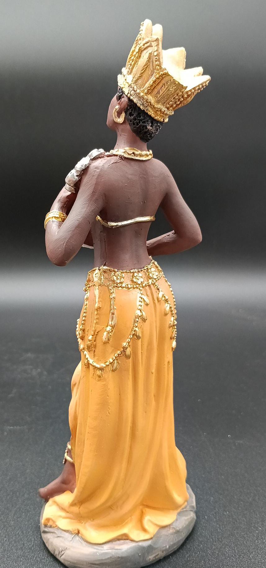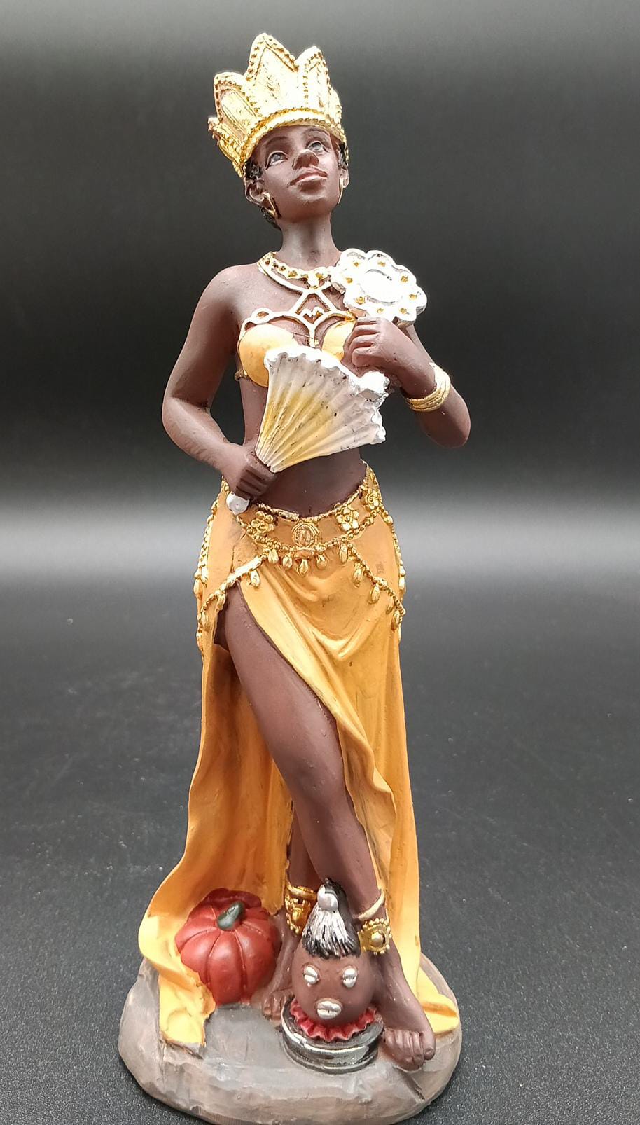 Oshun es reconocida como una guía compasiva que abre caminos hacia la abundancia, la sensibilidad emocional y la belleza interior. Esta figura, cuidadosamente elaborada, captura su fuerza suave pero poderosa, convirtiéndola en un elemento ideal para altares, espacios de devoción o rincones dedicados a la conexión espiritual.