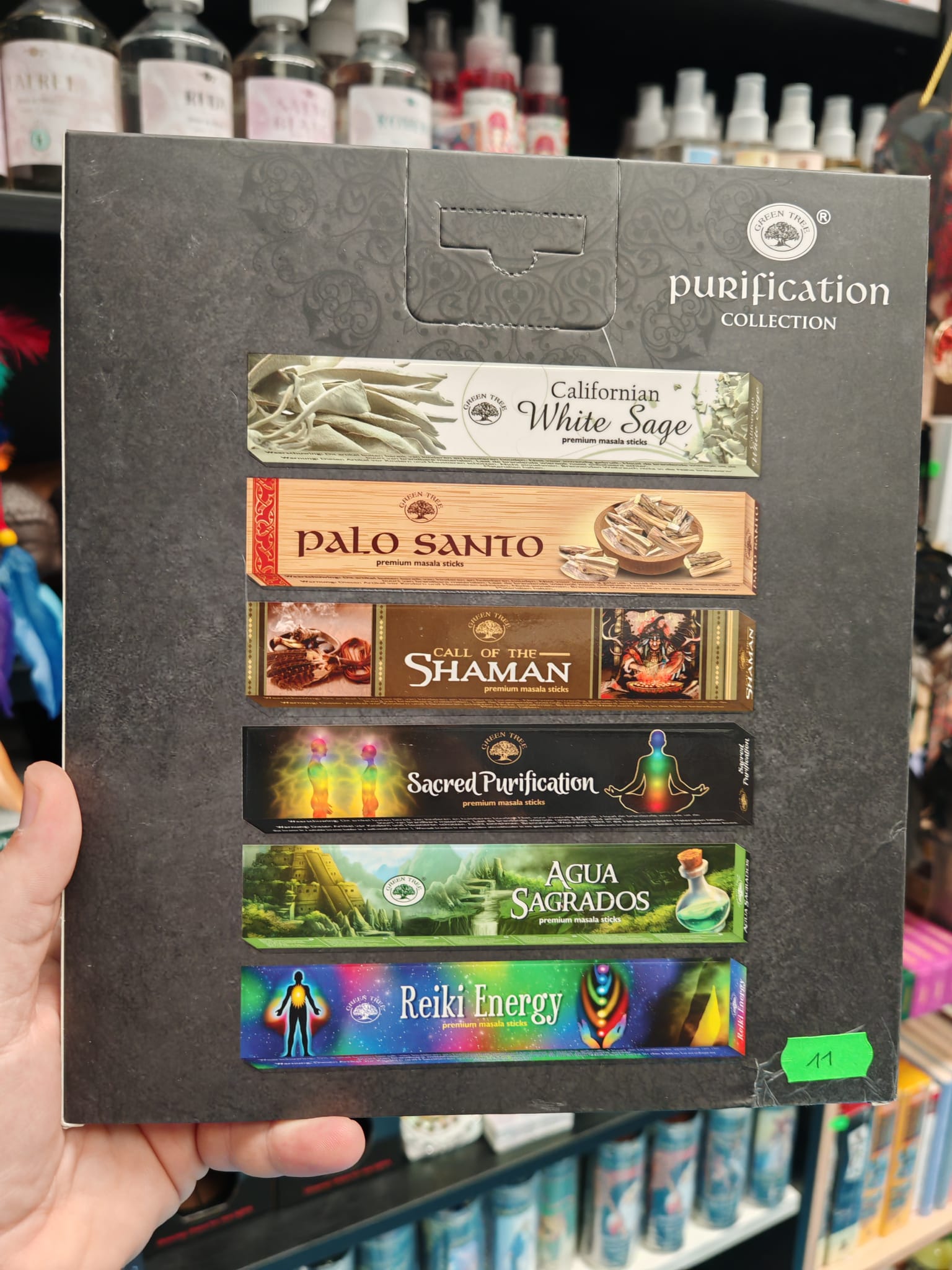 Experimente la poderosa Colección Green Tree Purification, que consta de 6 cajas de incienso de 15 g cada una, que suman un total de 90 g de purificación espiritual y ambiental. Cada caja contiene una cuidada selección de varitas de incienso elaboradas con ingredientes naturales de alta calidad, diseñadas para limpiar y purificar tu hogar, espacio de trabajo o entorno espiritual. Déjate envolver por la fragancia calmante y tonificante de estas varitas de incienso mientras se queman liberando su esencia y purificando el aire que te rodea. Descubre la sensación de renovación y revitalización que la Colección Green Tree Purification puede aportar a tu vida.