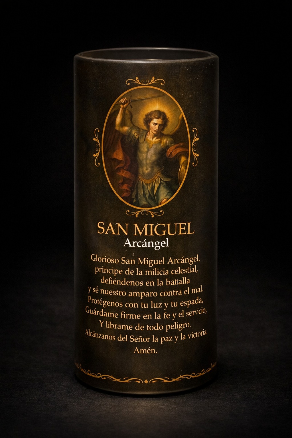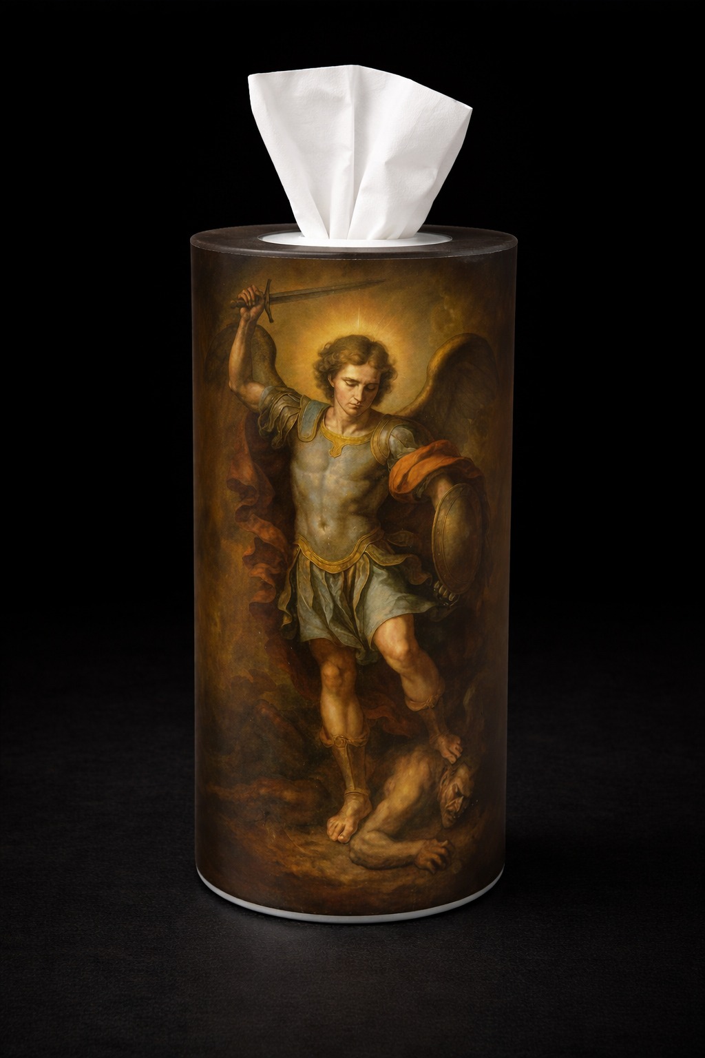 Caja cilíndrica decorada con una elegante imagen de San Miguel Arcángel, representado con espada y escudo, símbolo de protección, fuerza y victoria. Su diseño artístico, con acabados cálidos y fondo oscuro, convierte este producto en un elemento decorativo distinguido y con carácter.