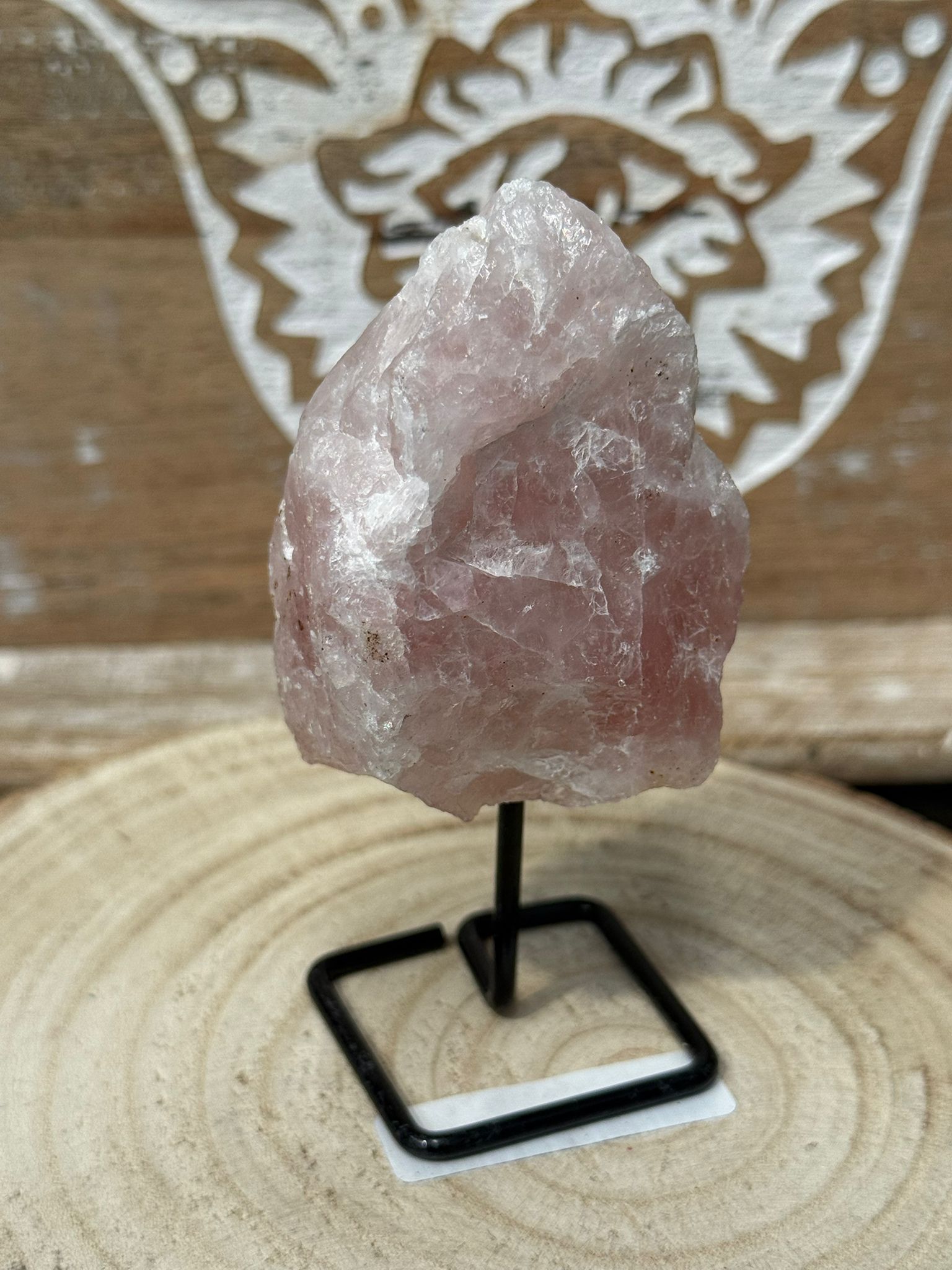 Peana de Metal con Cuarzo Rosa en Bruto – Amor Incondicional, Sanación Emocional y Apertura del Corazón