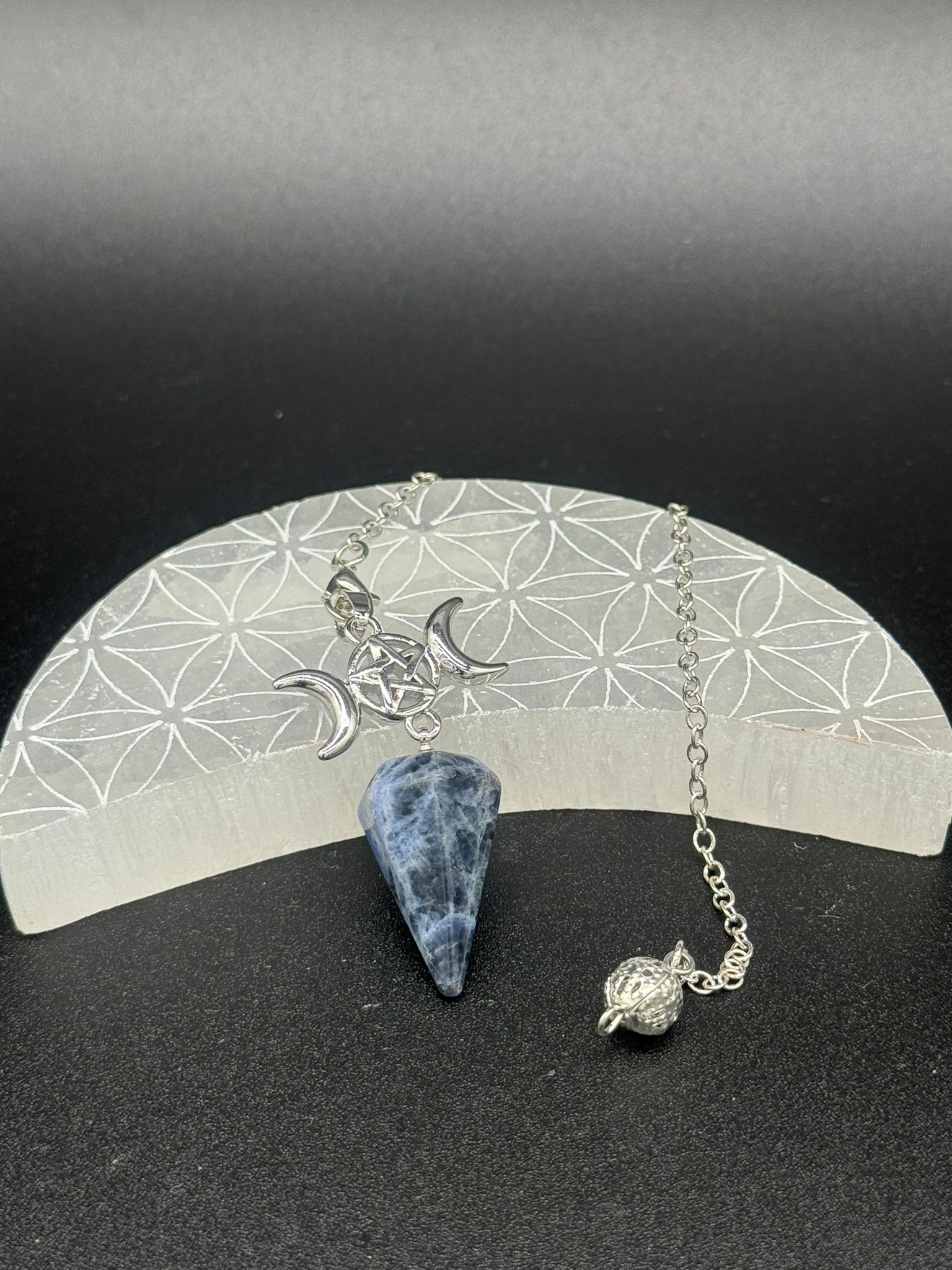 Este péndulo combina la profundidad espiritual del lapislázuli con el simbolismo de la Triple Luna, representación de la diosa en sus tres fases: doncella, madre y anciana. Es una herramienta ideal para quienes trabajan con la sabiduría interior, la conexión divina y los ciclos sagrados de la vida.