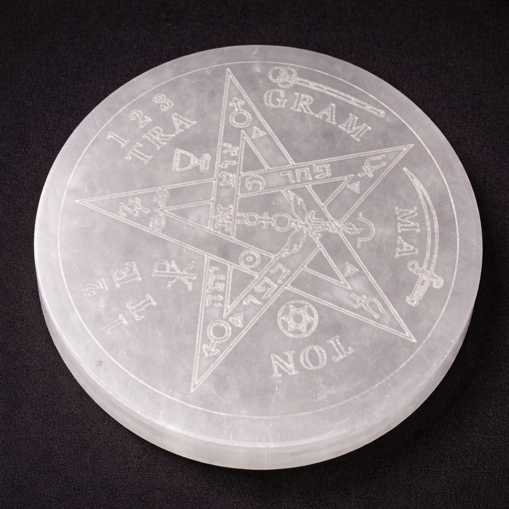 Esta poderosa placa de selenita con grabado del Tetragramatón es una herramienta esotérica esencial para la protección espiritual, la limpieza energética y la recarga de minerales. Con un diámetro aproximado de 10 cm, es perfecta para colocar en tu altar, espacio sagrado o zona de trabajo energético.