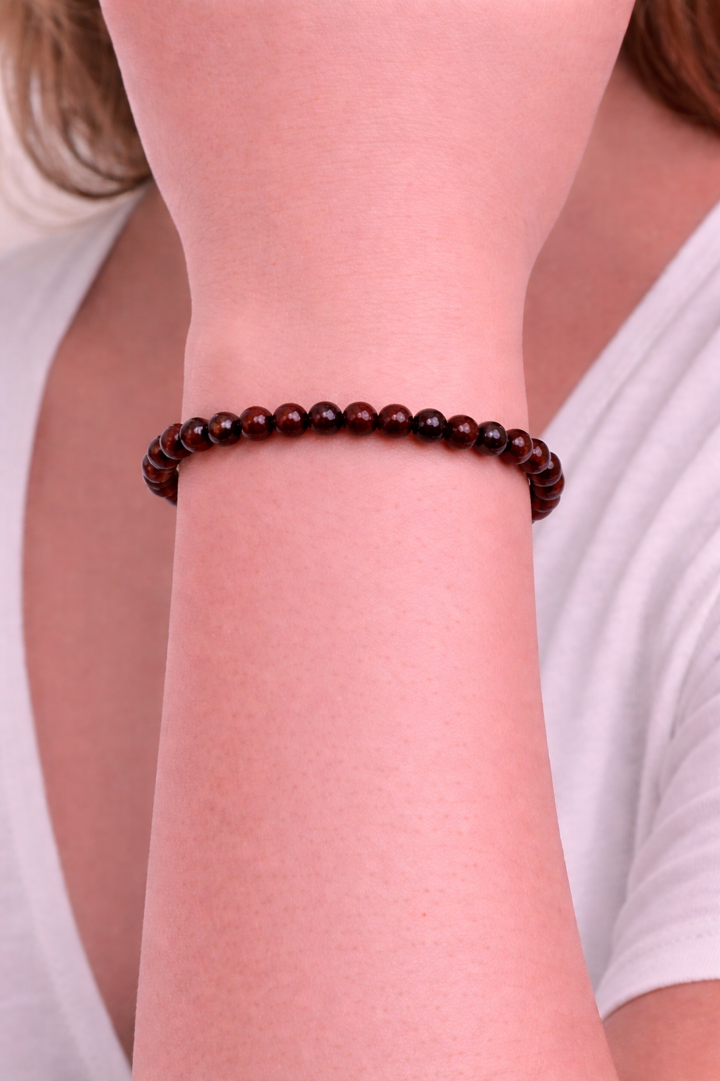 Pulsera elaborada con cuentas de granate natural de 4 mm, pulidas para resaltar su intenso tono rojo oscuro con sutiles reflejos profundos. Su tamaño discreto y su acabado brillante la convierten en una pieza elegante, cómoda y perfecta para el uso diario.