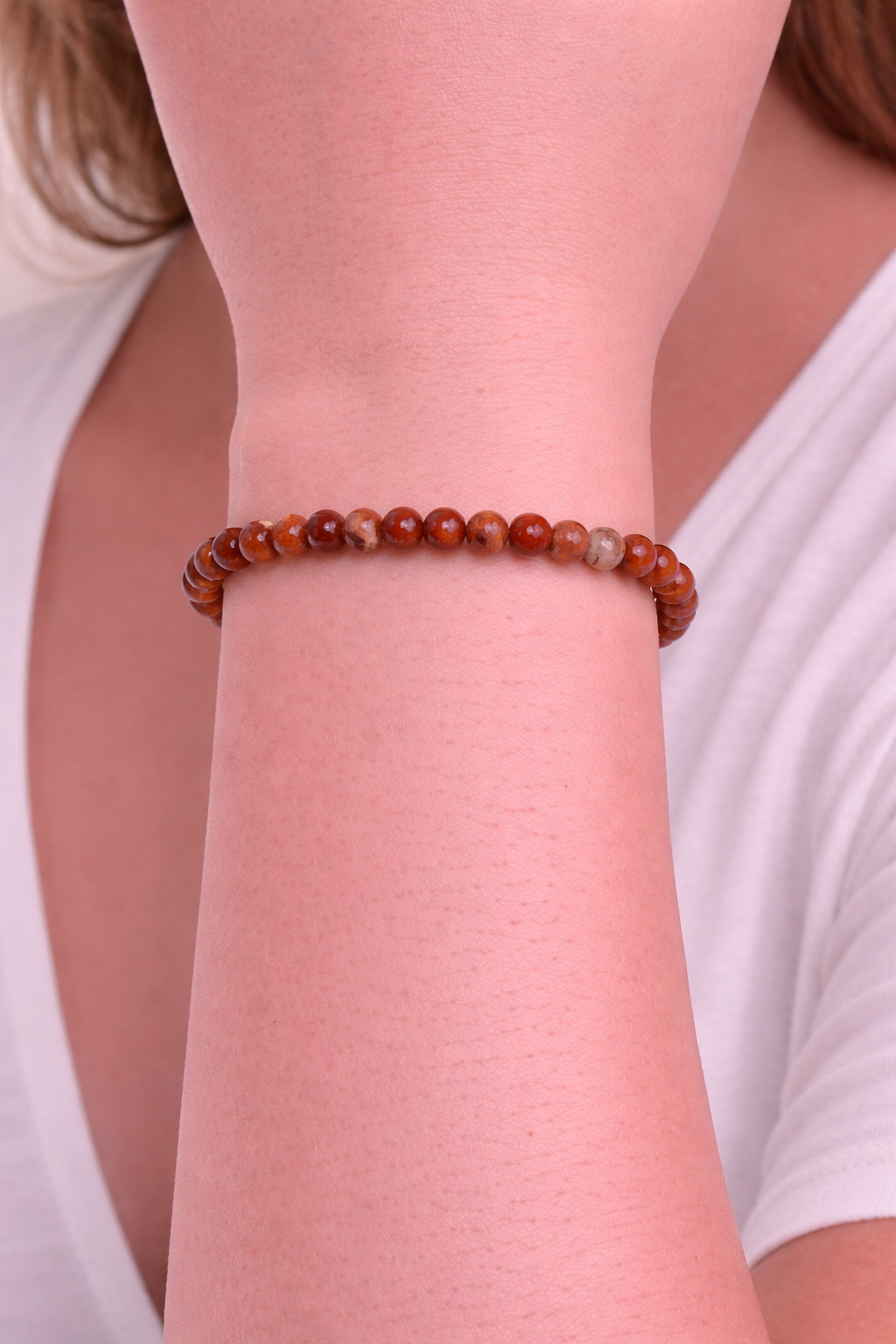Pulsera elaborada con cuentas de jaspe rojo natural de 4 mm, cuidadosamente pulidas para resaltar su intenso tono rojizo y su acabado brillante. Su tamaño discreto la convierte en una pieza cómoda y versátil, ideal para el uso diario.