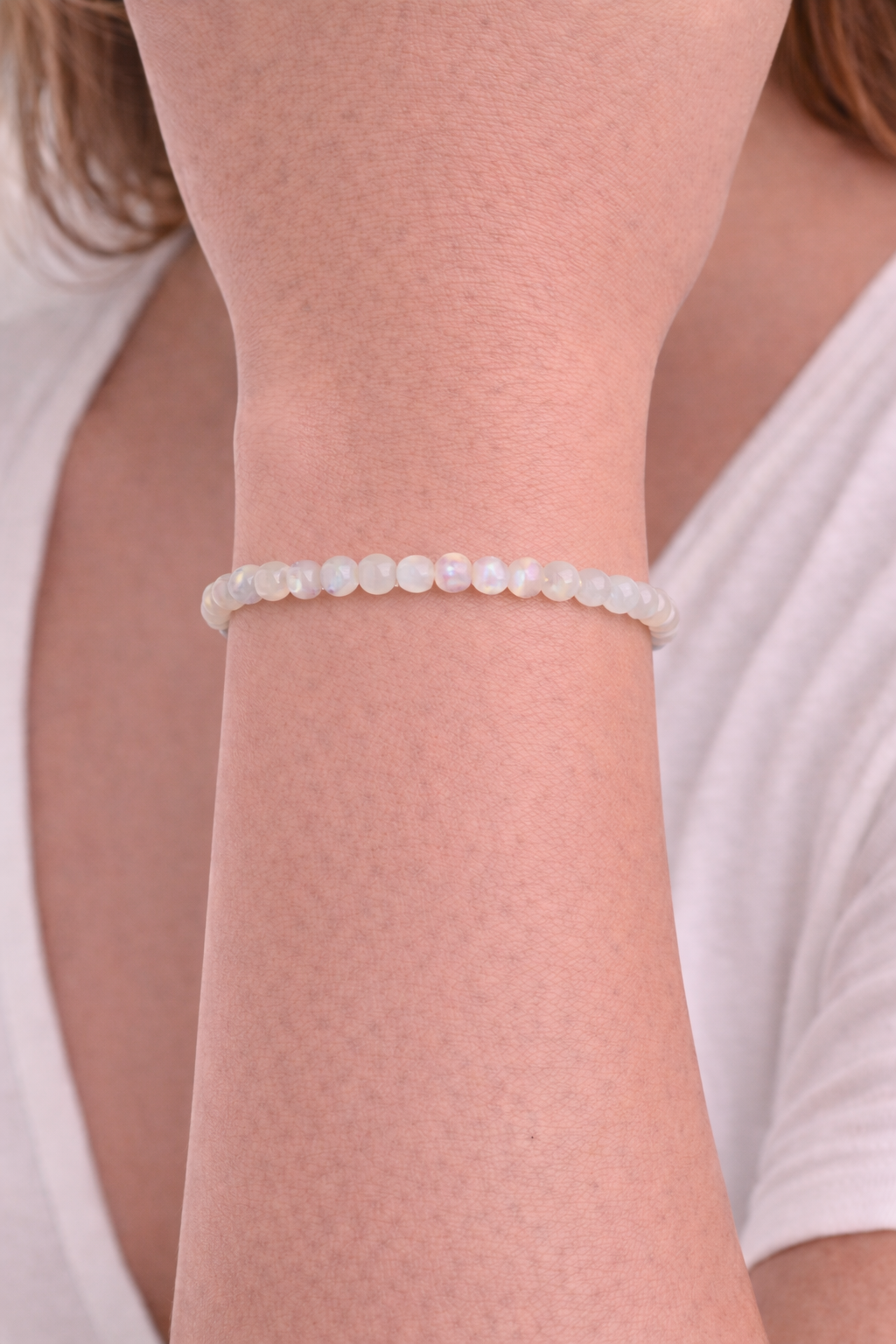 Pulsera elaborada con cuentas de piedra luna natural de 4 mm, cuidadosamente pulidas para resaltar sus suaves tonos blancos y nacarados con delicados reflejos iridiscentes. Su acabado brillante y su tamaño discreto la convierten en una pieza elegante, ligera y cómoda para el uso diario.