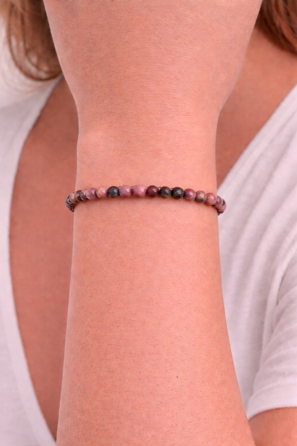 Pulsera elaborada con cuentas de rodonita natural de 4 mm, cuidadosamente pulidas para resaltar sus delicados tonos rosados combinados con vetas y contrastes oscuros característicos de esta piedra. Cada pulsera presenta un patrón único, lo que la convierte en una pieza especial y diferente.