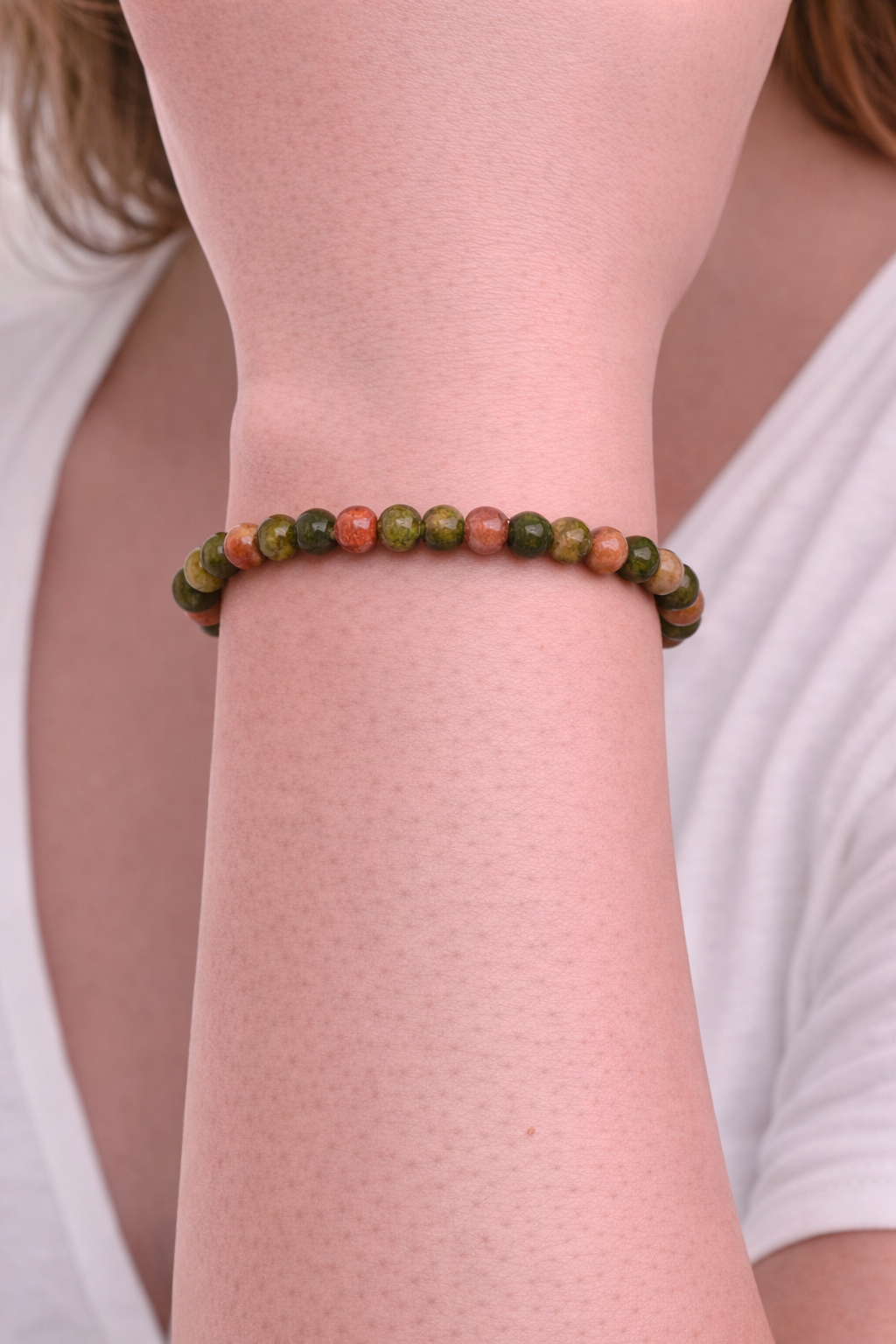 Pulsera elaborada con cuentas de unakita natural de 4 mm, pulidas para resaltar su combinación característica de tonos verdes y rosados, creando un contraste armonioso y natural. Cada pulsera presenta variaciones propias de la piedra, lo que la convierte en una pieza única.