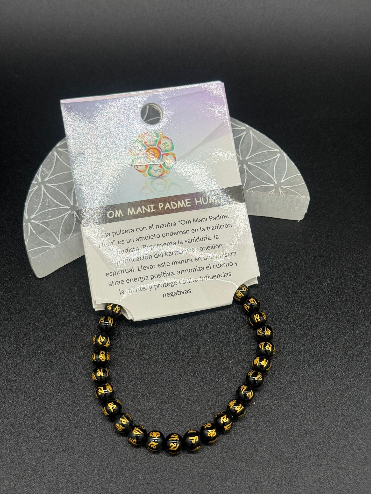 Esta pulsera está diseñada con el mantra sagrado Om Mani Padme Hum, uno de los más poderosos y reconocidos dentro del budismo tibetano. Cada palabra del mantra representa una etapa del camino hacia la iluminación y la purificación del cuerpo, la palabra y la mente.