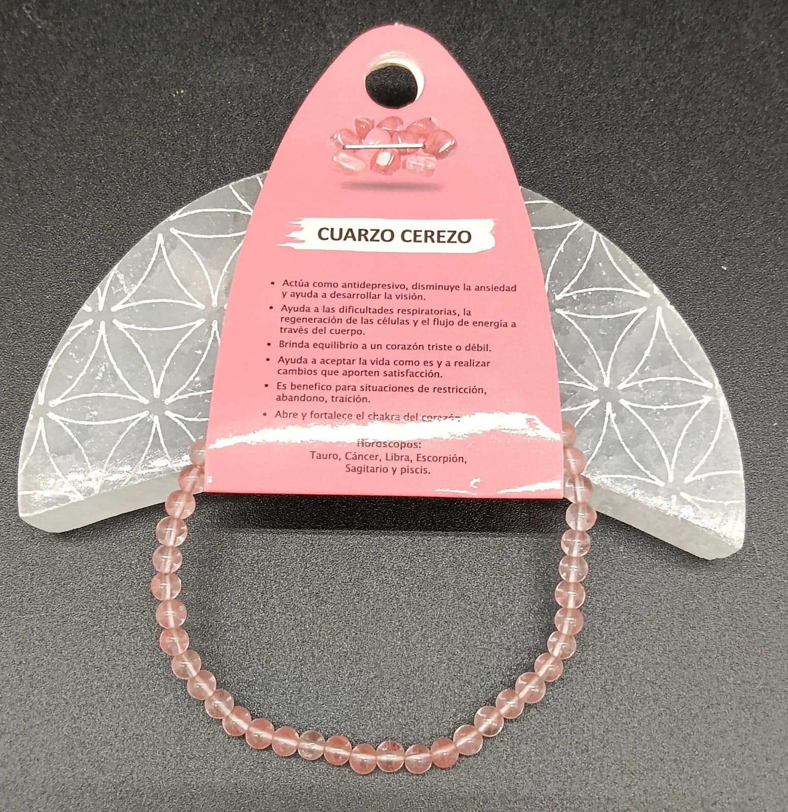 Llevar una pulsera de cuarzo cereza permite mantener su vibración amorosa cerca del campo energético, promoviendo la armonía emocional y una conexión más consciente con los sentimientos. Es una excelente opción para quienes buscan equilibrio emocional, dulzura interior y bienestar espiritual.