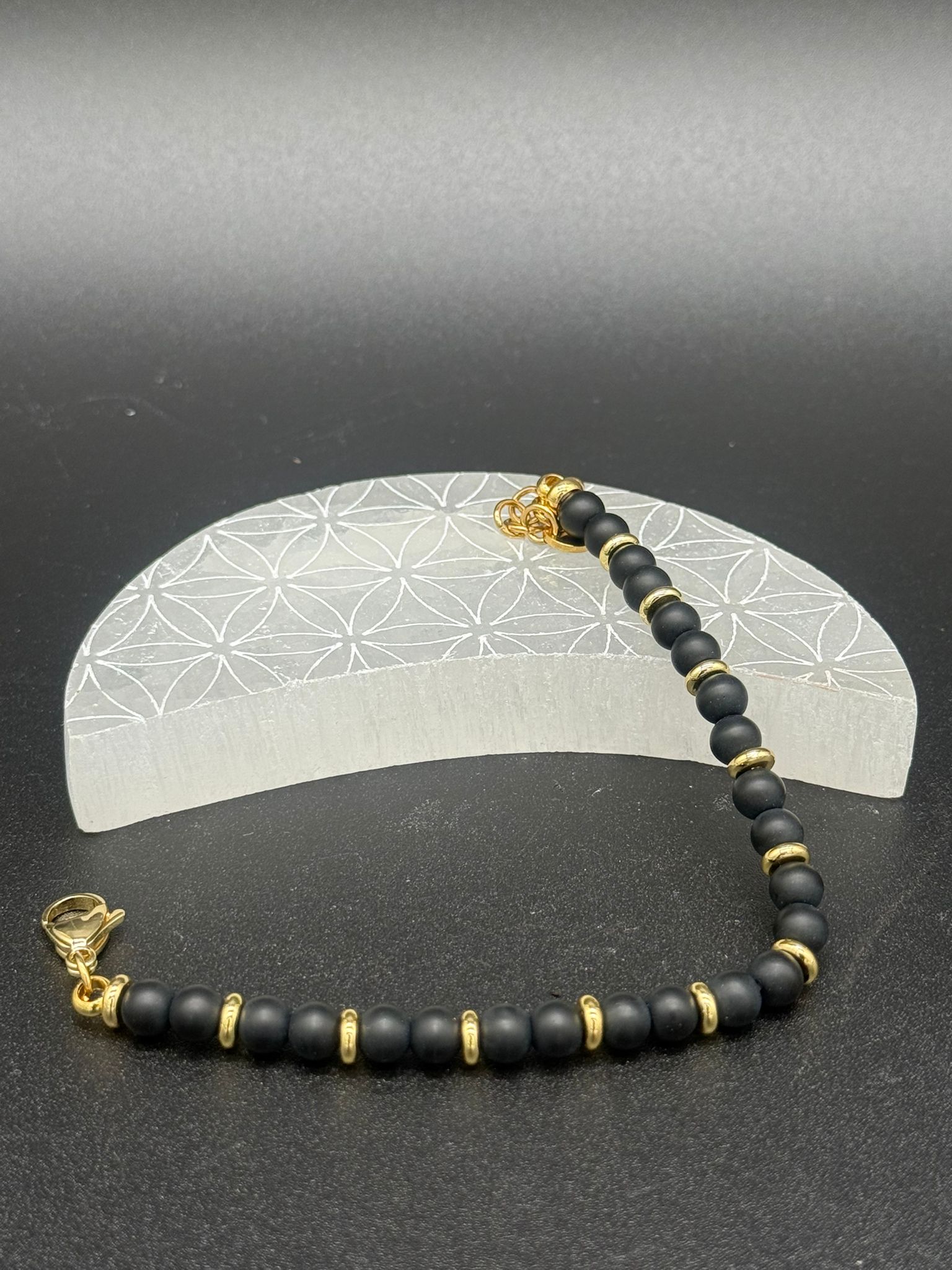 El ónice mate ayuda a equilibrar el aura, protege contra influencias externas y promueve la confianza y la fuerza interior. El acero inoxidable aporta durabilidad y un diseño moderno que se adapta a cualquier ocasión.