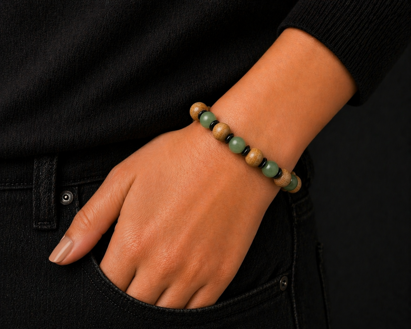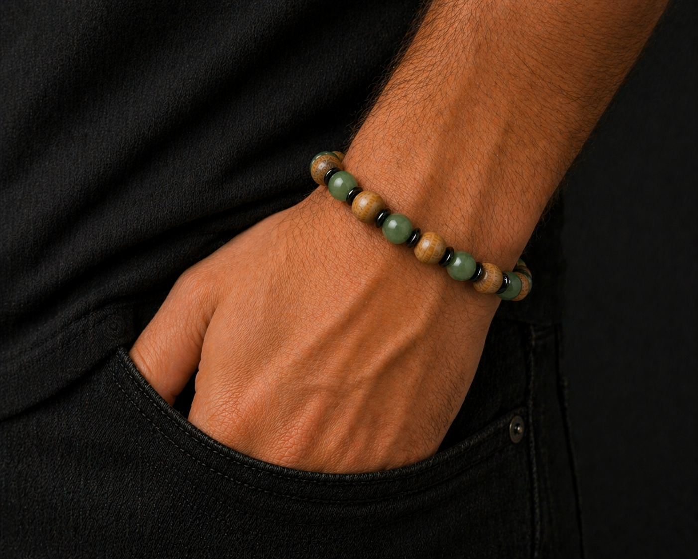 Esta pulsera artesanal combina la energía ancestral del palo santo con la vibración armonizadora del jade verde, creando un amuleto poderoso para el bienestar integral.