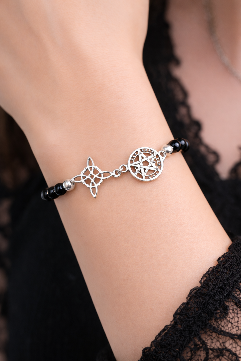 Pulsera realizada con cuentas de ónix negro natural, seleccionadas por su acabado pulido y su tono profundo e intenso, combinadas con dijes centrales de plata de ley 925 finamente trabajados. Incorpora un tetragramatón circular, símbolo tradicional de protección y equilibrio espiritual, junto a un nudo de bruja, asociado a la protección, la unión de energías y la conexión espiritual.