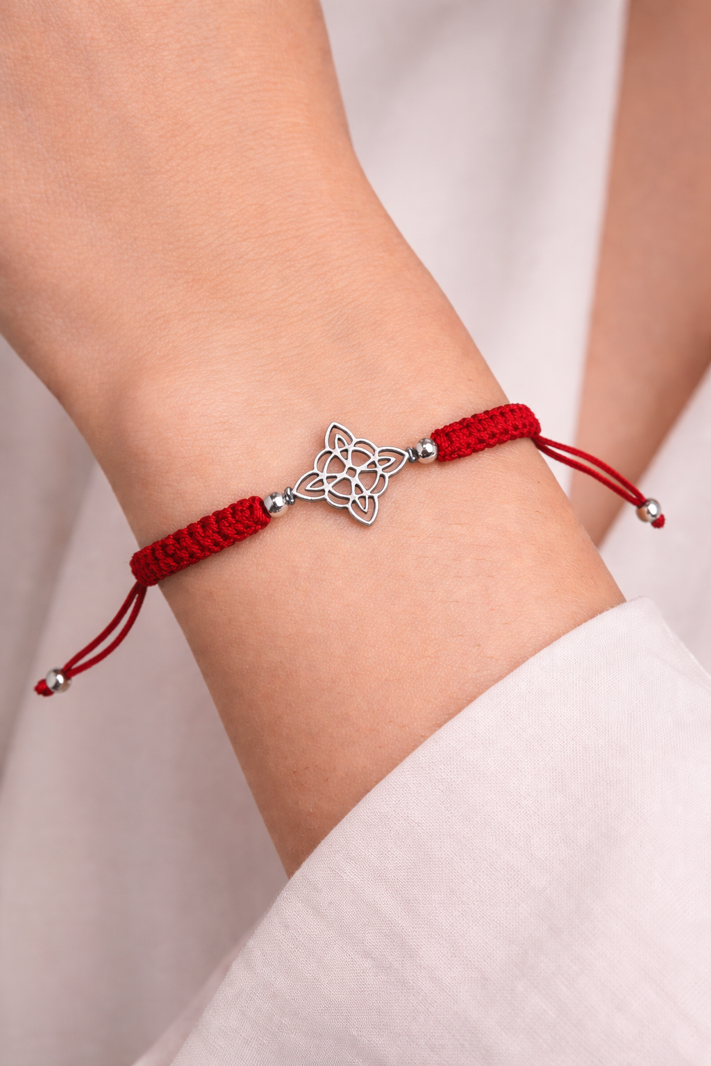 Pulsera elaborada en macramé rojo ajustable, con símbolo central del Nudo de Bruja en tono plata. El tejido artesanal ofrece resistencia y comodidad, adaptándose fácilmente a diferentes tamaños de muñeca gracias a su cierre regulable.