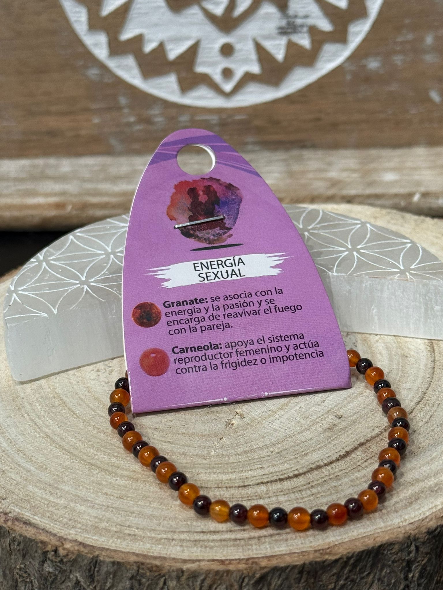 La pulsera Energía Sexual combina la intensidad del granate con la calidez de la cornalina, creando una poderosa sinergia que activa la energía vital, despierta la pasión y fortalece el vínculo con el placer y la expresión del deseo.