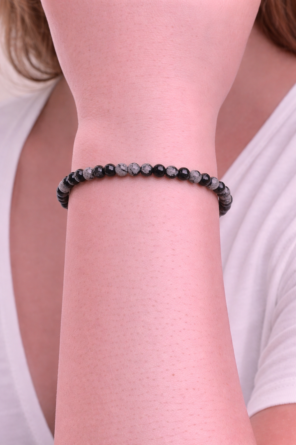 Pulsera elaborada con cuentas de obsidiana nevada natural de 4 mm, pulidas para resaltar su característico contraste entre el negro profundo y las inclusiones grises o blancas que recuerdan copos de nieve. Cada pulsera presenta un patrón único, propio de la formación natural de la piedra.
