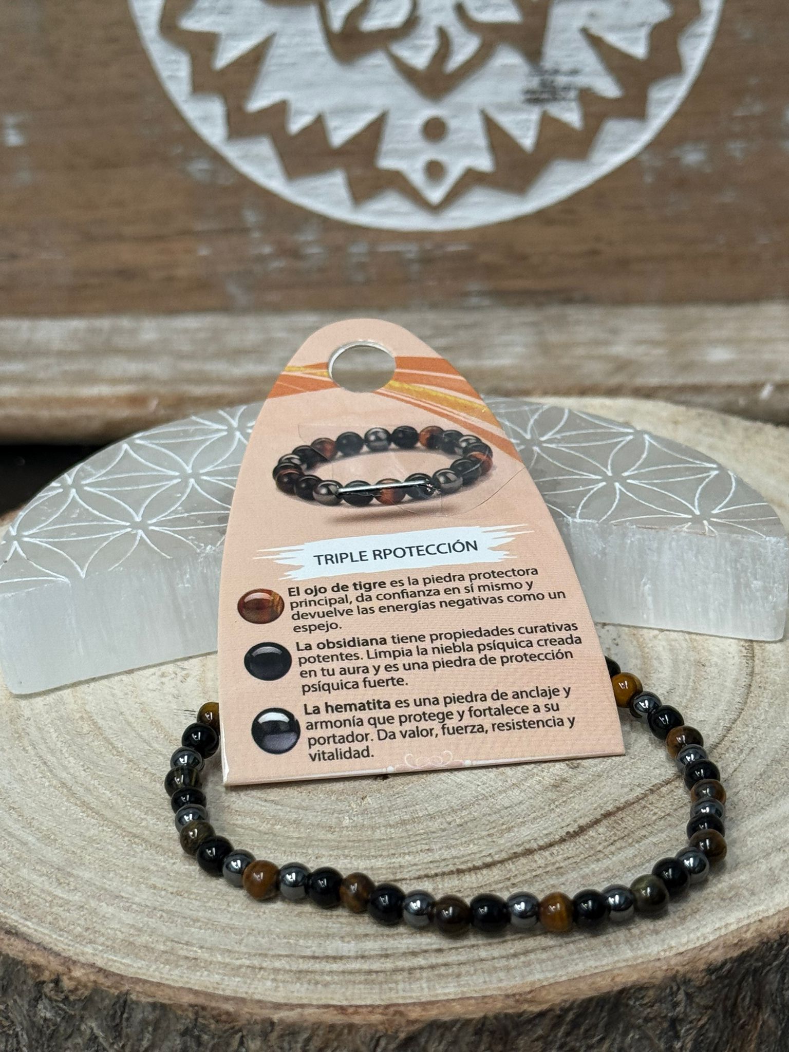 Pulsera Triple Protección (Ojo Tigre-Obsidiana-Hematite) 4mm