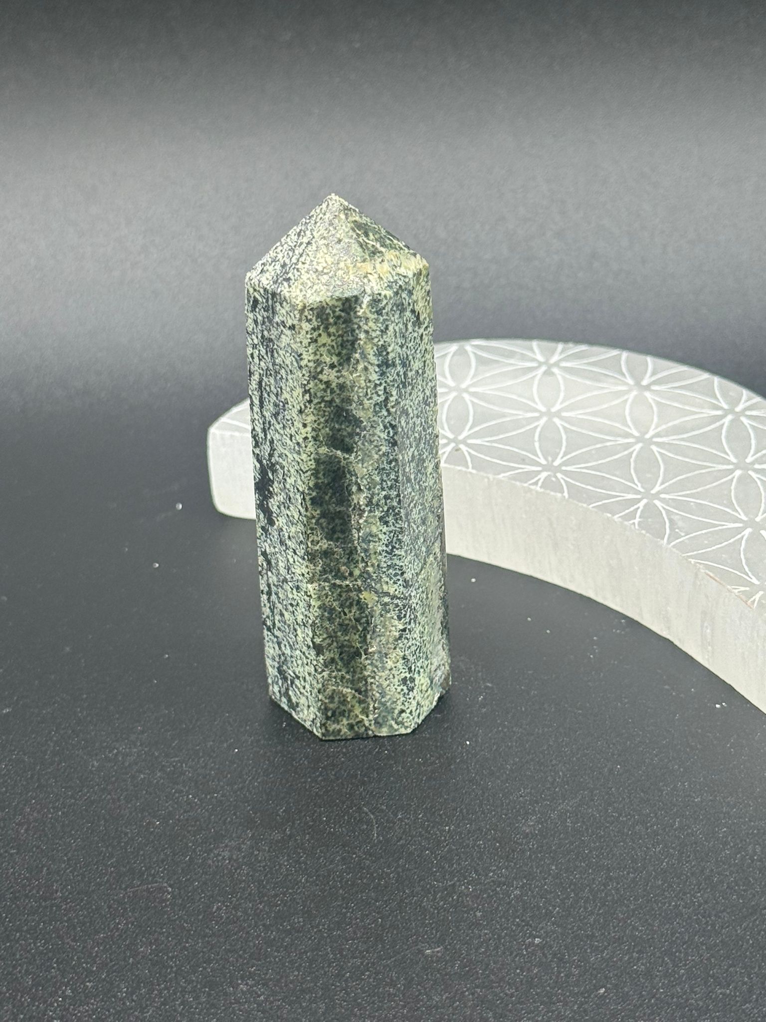 Estas puntas de crisotilo natural, de entre 8 y 9 cm de alto aproximadamente, son piezas de energía calmante y protectora, profundamente conectadas con la sabiduría del cuerpo, la limpieza energética y la transformación desde el interior. Talladas en forma de torre, canalizan la energía de forma enfocada y constante, facilitando el equilibrio entre mente, cuerpo y espíritu. Su aspecto fibroso y vetado, con tonos que pueden variar entre verdes, grises y plateados, le confiere una presencia sutil pero poderosa.