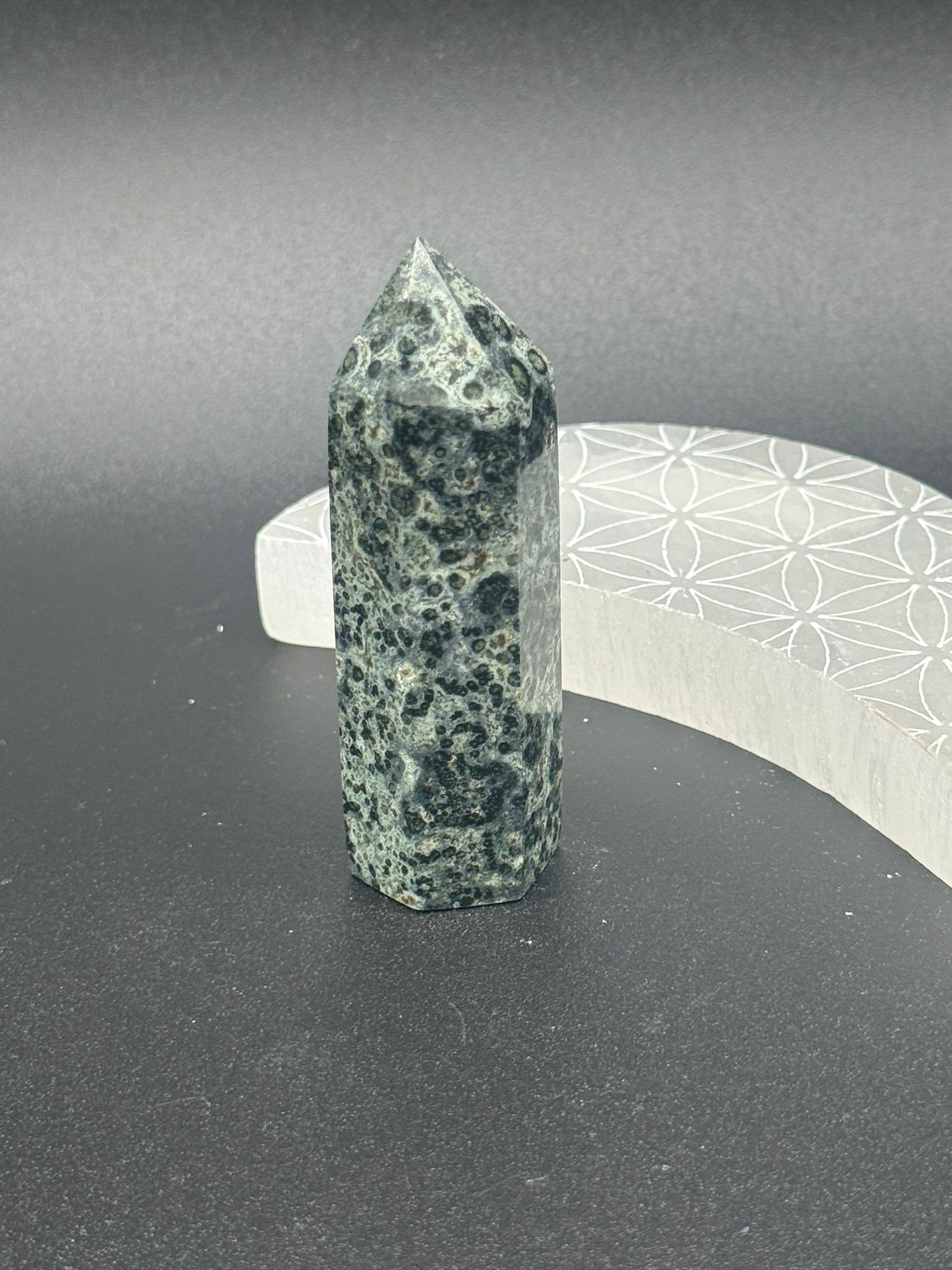 Estas puntas de jaspe orbicular natural, de entre 8 y 9 cm de alto aproximadamente, son piezas profundamente conectadas con la sabiduría de la tierra y el flujo cíclico de la vida. Talladas en forma de torre, proyectan la energía de forma ascendente, ayudando a crear estabilidad emocional, serenidad y una conexión armónica con la naturaleza. Su superficie moteada, con círculos y formas orgánicas de distintos tonos —que pueden incluir verdes, ocres, grises, marrones o rosados— recuerda a la estructura celular o a los patrones de crecimiento natural, evocando equilibrio y regeneración.