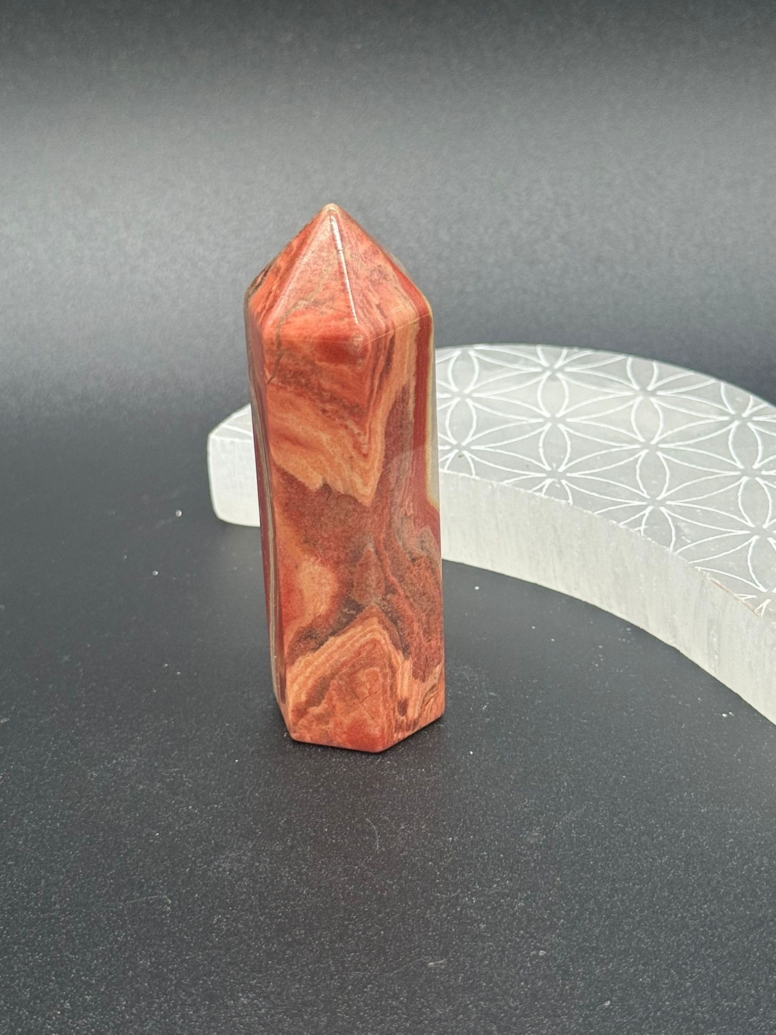 Estas puntas de jaspe rojo natural, de entre 8 y 9 cm de alto aproximadamente, son piezas de gran fuerza energética que aportan vitalidad, estabilidad y coraje. Talladas en forma de torre, canalizan la energía de forma ascendente y constante, ayudando a reforzar el enraizamiento, la confianza en uno mismo y la conexión con la fuerza vital interna. Su color rojo terroso, profundo y uniforme, transmite seguridad, presencia y una energía cálida que sostiene en momentos de esfuerzo o desafío.