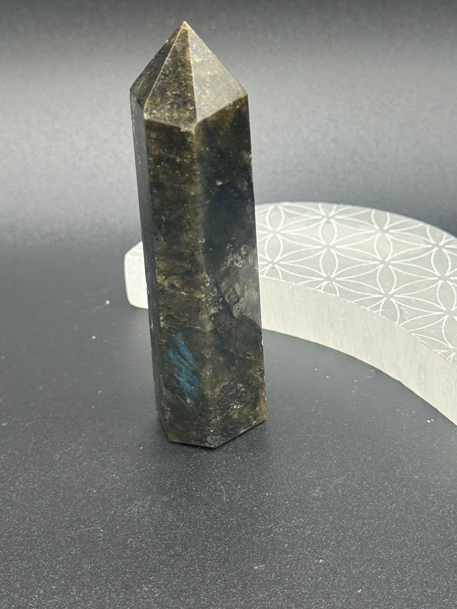 Estas puntas de labradorita natural, de entre 8 y 9 cm de alto aproximadamente, son piezas únicas de gran poder espiritual y energético. Talladas en forma de torre, cada una presenta reflejos iridiscentes característicos de la labradorita —con tonos que varían entre azules, verdes y dorados— revelando su energía cambiante y misteriosa. Su forma canaliza y dirige la energía hacia el plano superior, convirtiéndola en una herramienta poderosa para protección psíquica, intuición y transformación interior.