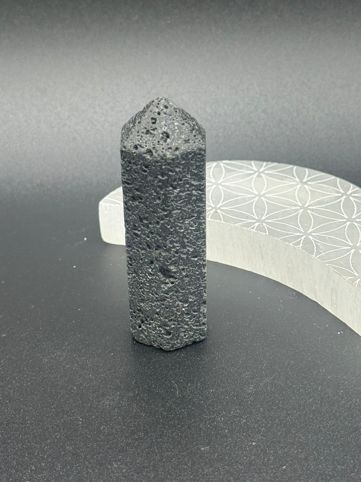 Estas puntas de piedra lava natural, de entre 8 y 9 cm de alto aproximadamente, son elementos profundamente conectados con la fuerza elemental de la tierra y el fuego. Talladas en forma de torre, canalizan una energía intensa y enraizadora que promueve la estabilidad, la transformación interior y la conexión con la energía vital. Su textura porosa y su color negro mate hablan de su origen volcánico, cargado de poder ancestral y energía primaria.