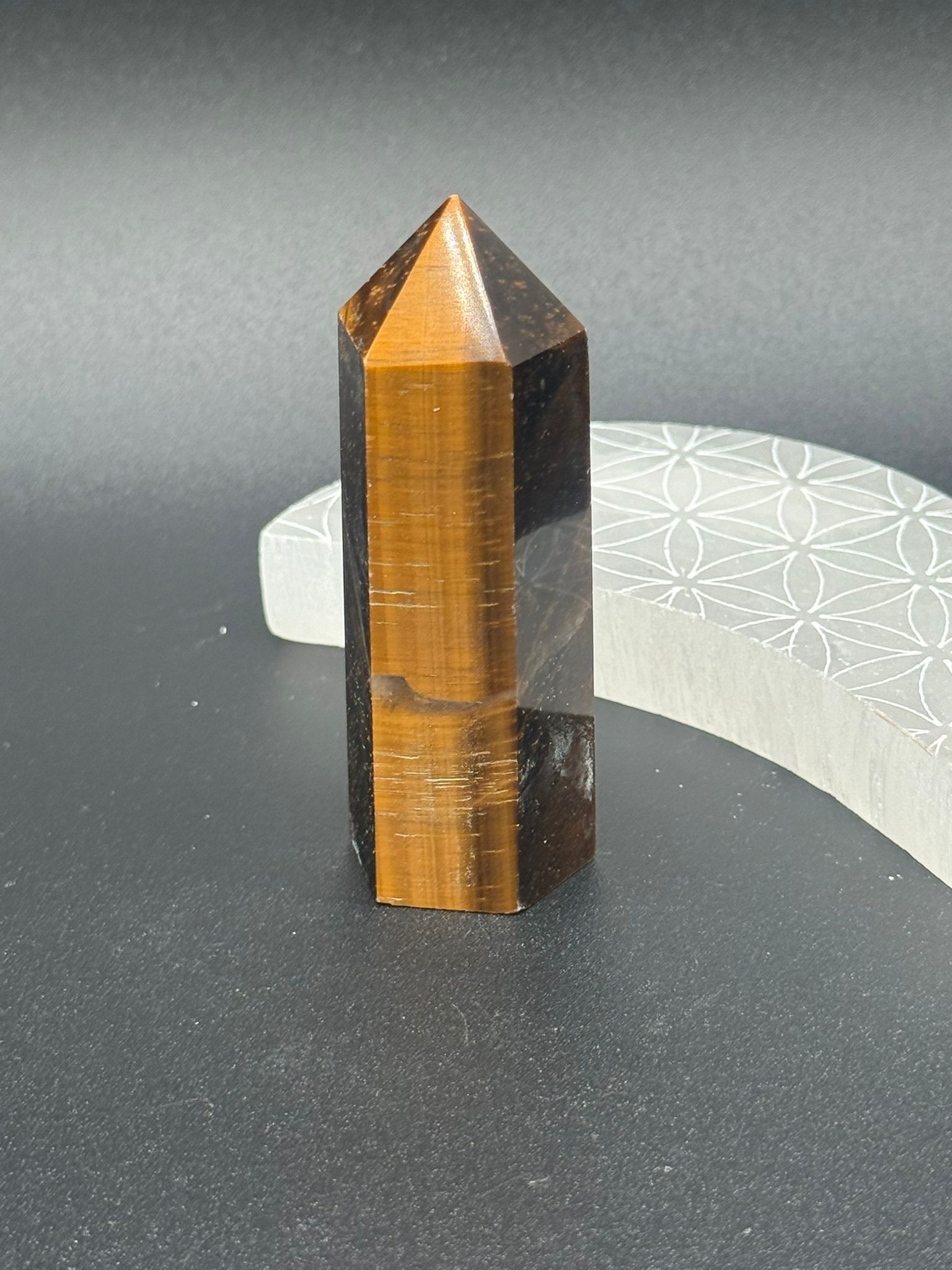 Estas puntas de ojo de tigre natural, de entre 8 y 9 cm de alto aproximadamente, son poderosas piezas de protección, enfoque y fuerza interior. Talladas en forma de torre, actúan como canalizadoras de energía firme y ascendente, ayudando a enraizar la intención, disipar el miedo y fortalecer la voluntad. Su superficie refleja los característicos destellos dorados y marrones que parecen moverse con la luz, símbolo del dinamismo energético de esta piedra.