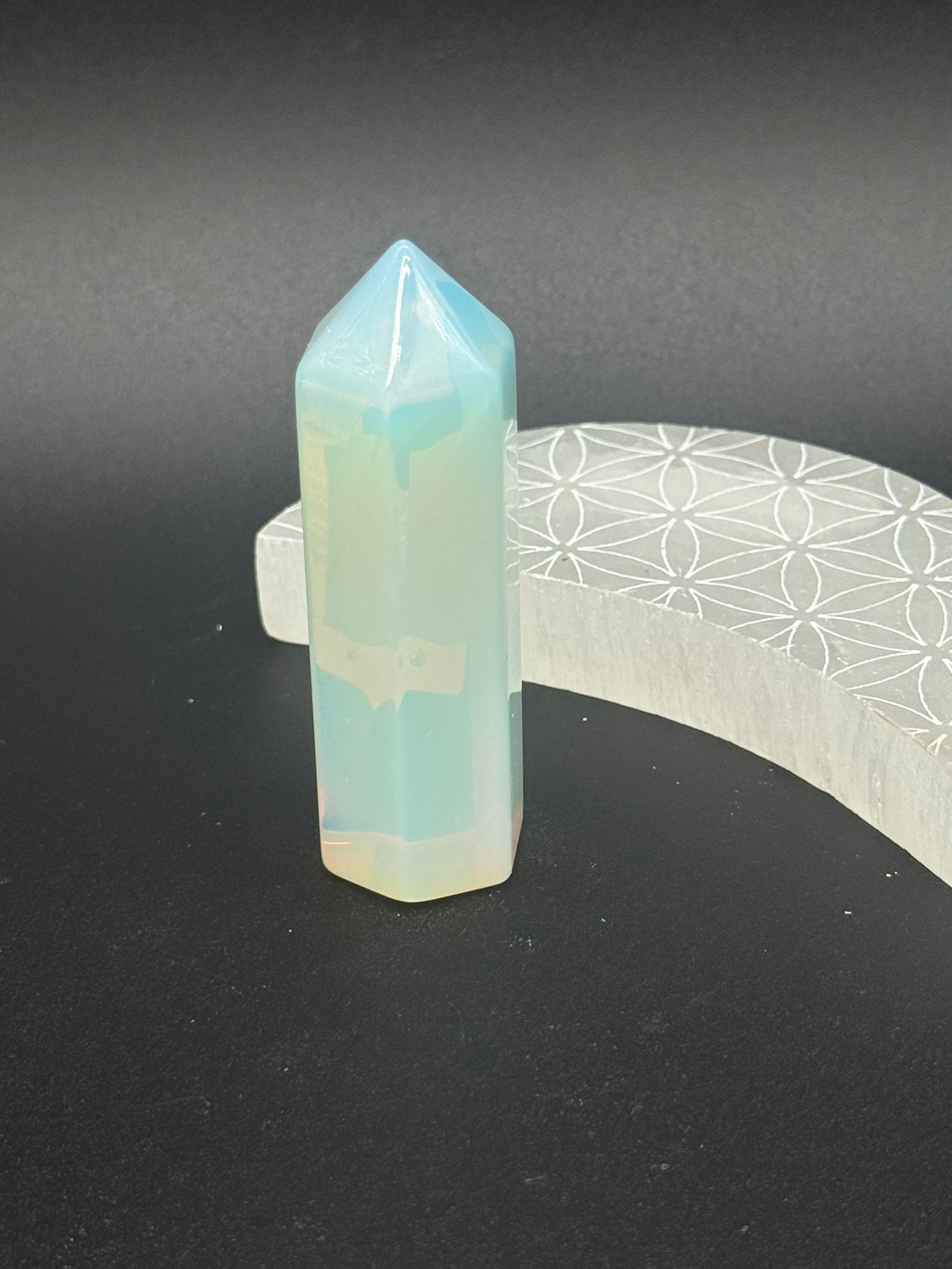 Estas puntas de opalina, de entre 8 y 9 cm de alto aproximadamente, son piezas de energía suave y luminosa, ideales para armonizar emociones, calmar la mente y potenciar la conexión espiritual. Talladas en forma de torre, actúan como canalizadoras de energía elevada, favoreciendo la claridad emocional y la serenidad interior. Su superficie translúcida refleja tonos nacarados, azules y dorados, que cambian delicadamente según la luz, aportando una sensación de calma y misterio.