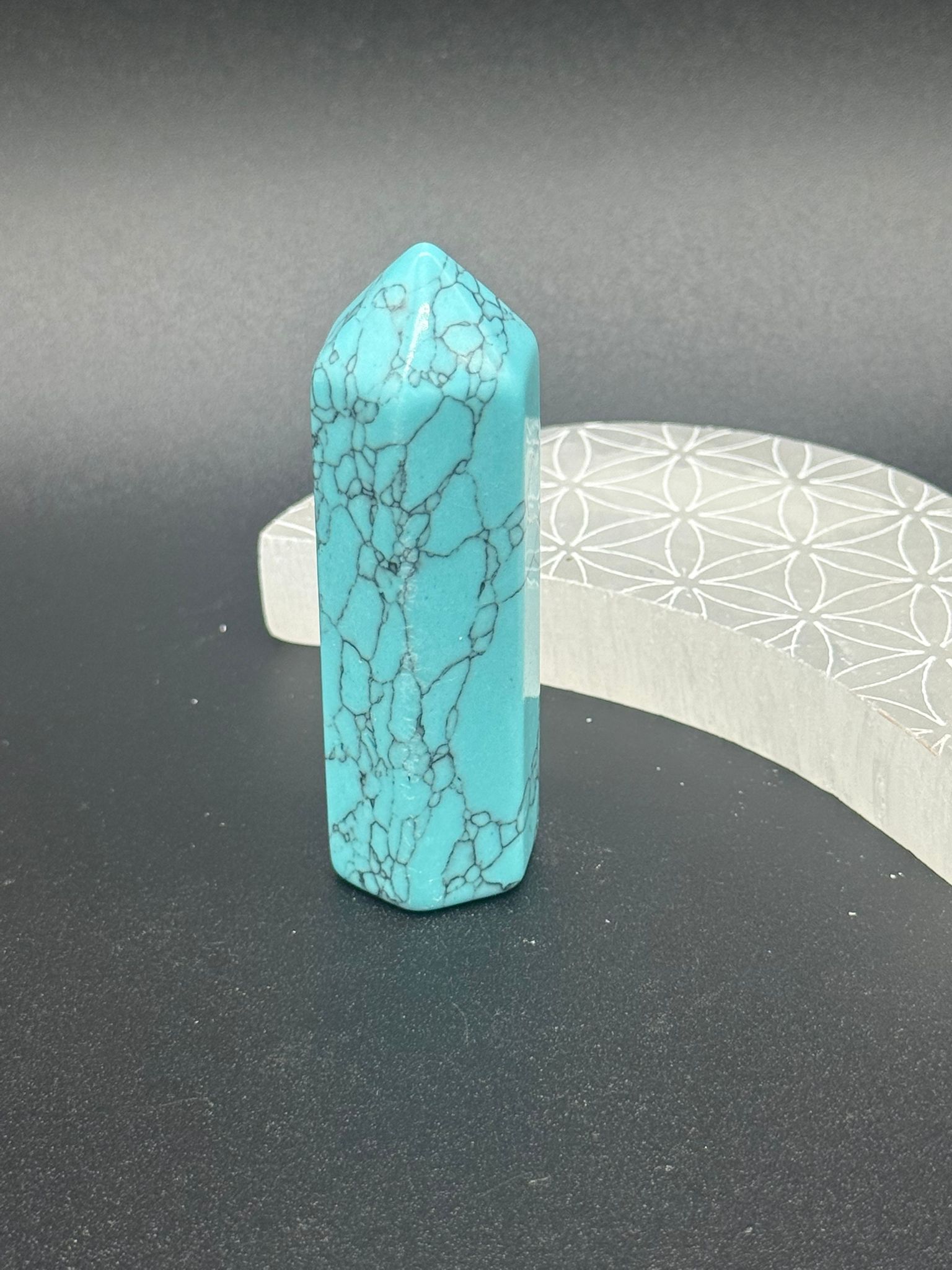 Estas puntas de turquesa natural, de entre 8 y 9 cm de alto aproximadamente, son poderosas herramientas de protección, comunicación y equilibrio espiritual. Talladas en forma de torre, canalizan la energía hacia arriba, facilitando la claridad mental, la expresión auténtica y la conexión con planos superiores. Su característico color azul verdoso con vetas naturales aporta una vibración armonizadora y sanadora.