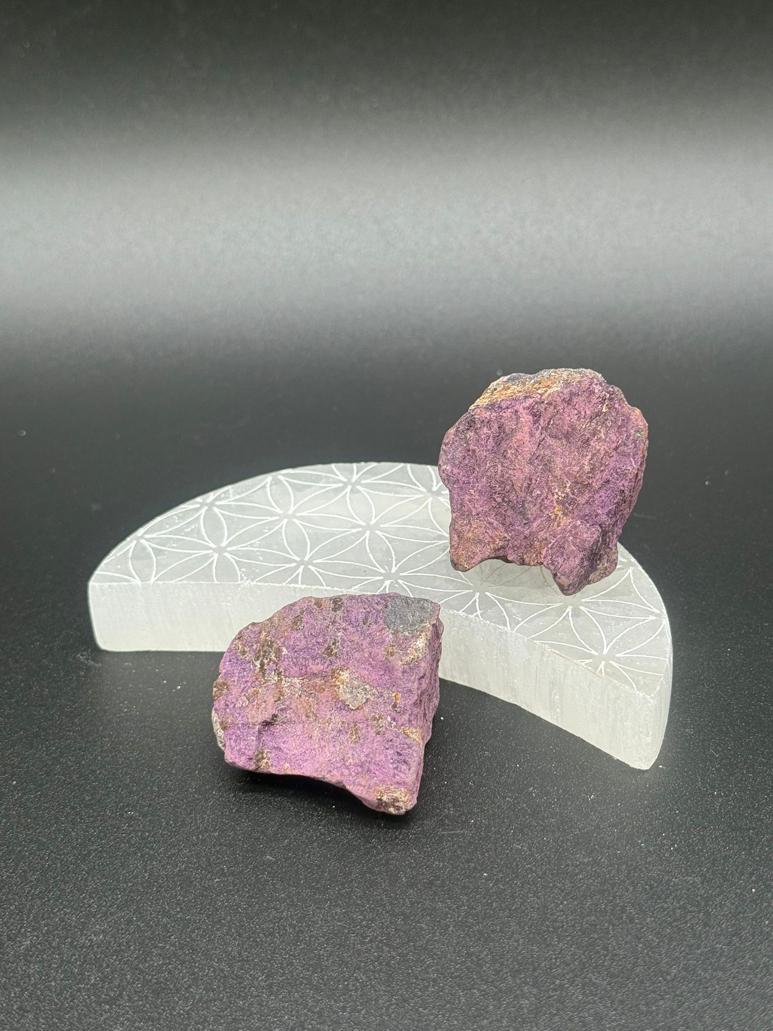 La purpurita también aporta protección espiritual y claridad mental, ayudando a mantener una visión elevada incluso en momentos de confusión o cambio. Estimula la intuición, la inspiración y la conexión con guías espirituales.