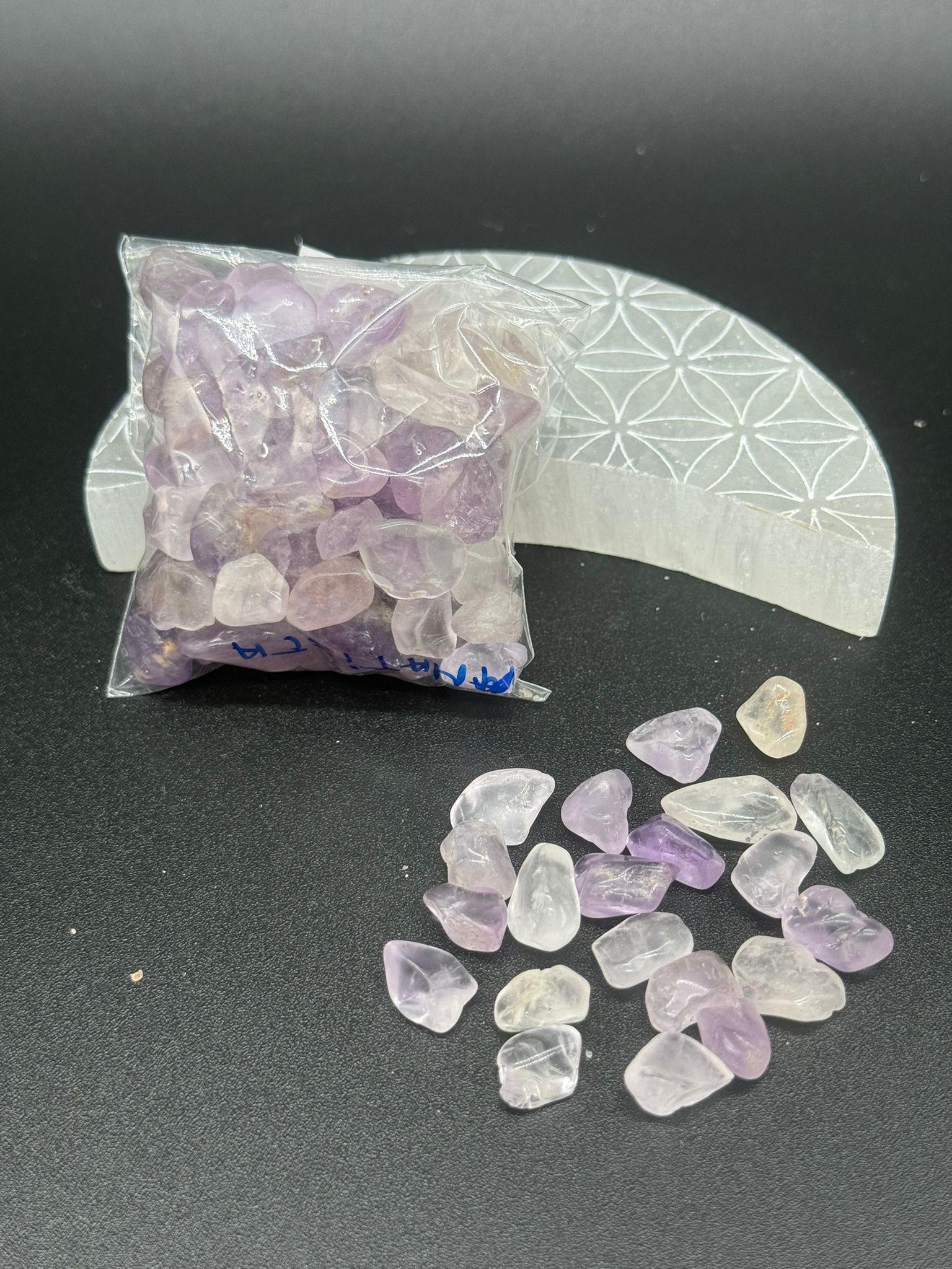 Estas bolsitas de plástico contienen aproximadamente 60 gramos de rodados naturales de amatista, piedras pulidas de tamaño pequeño a mediano que conservan la vibración elevada y la energía protectora propia de este mineral. Su tono violeta intenso varía en cada pieza, reflejando la belleza y singularidad de la amatista, una piedra ampliamente reconocida por sus propiedades espirituales y calmantes.