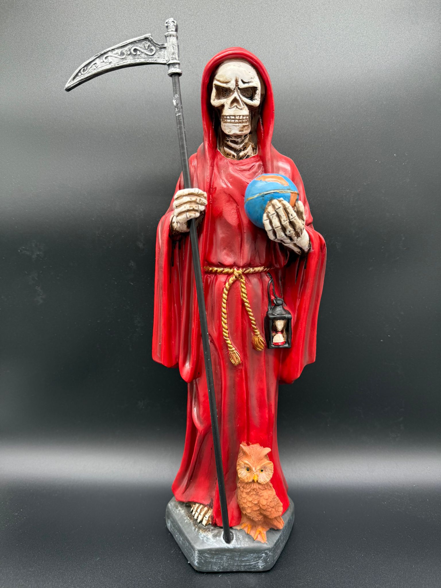 Esta imponente figura de Santa Muerte roja de 40 cm irradia una energía intensa y poderosa, vinculada al amor, la pasión, el deseo y la fuerza emocional. Su color rojo representa el fuego del corazón, la sangre que da vida y la intensidad de los vínculos humanos.
