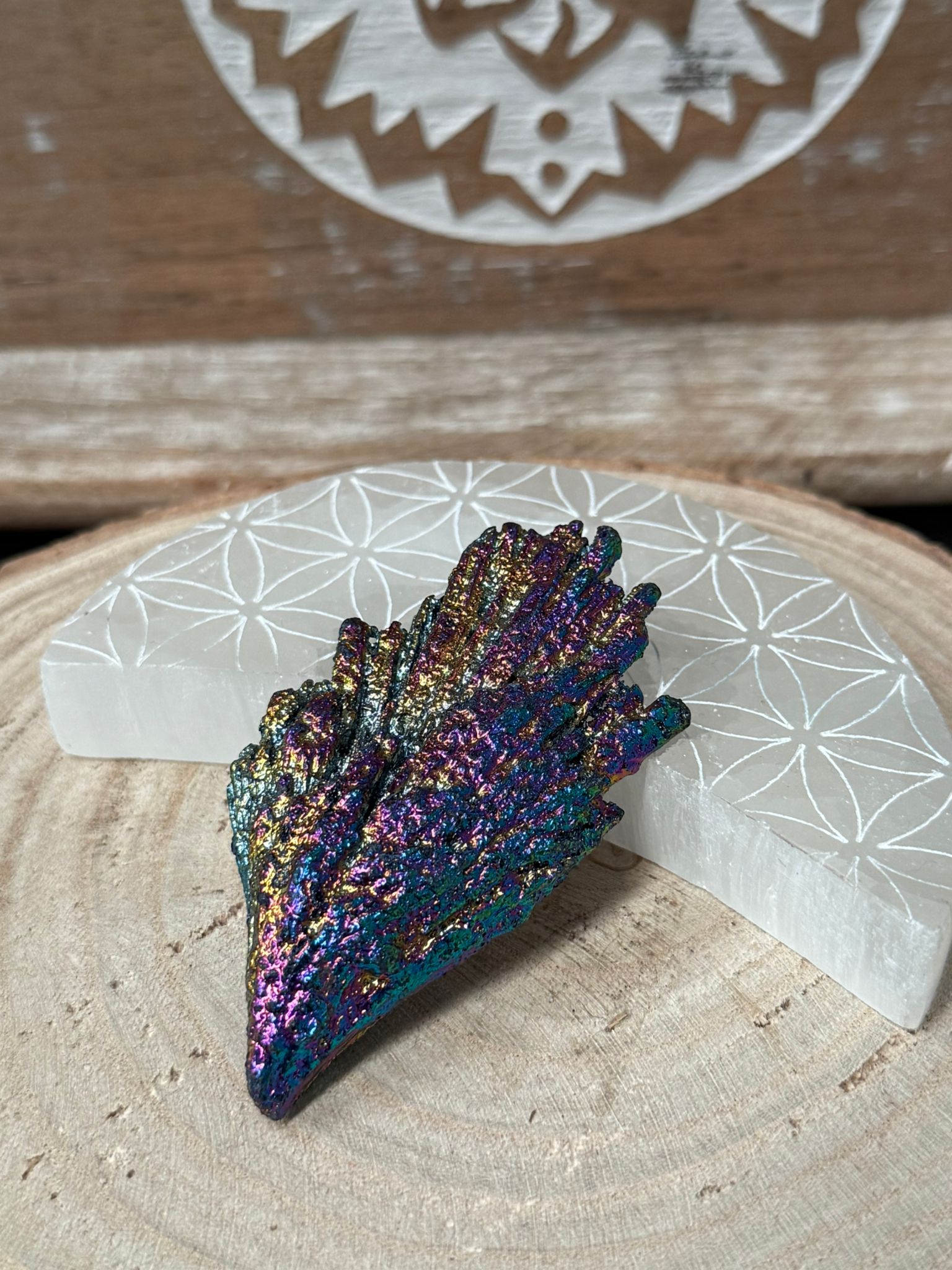 Material: Taramita natural tratada con titanio, con acabado iridiscente.