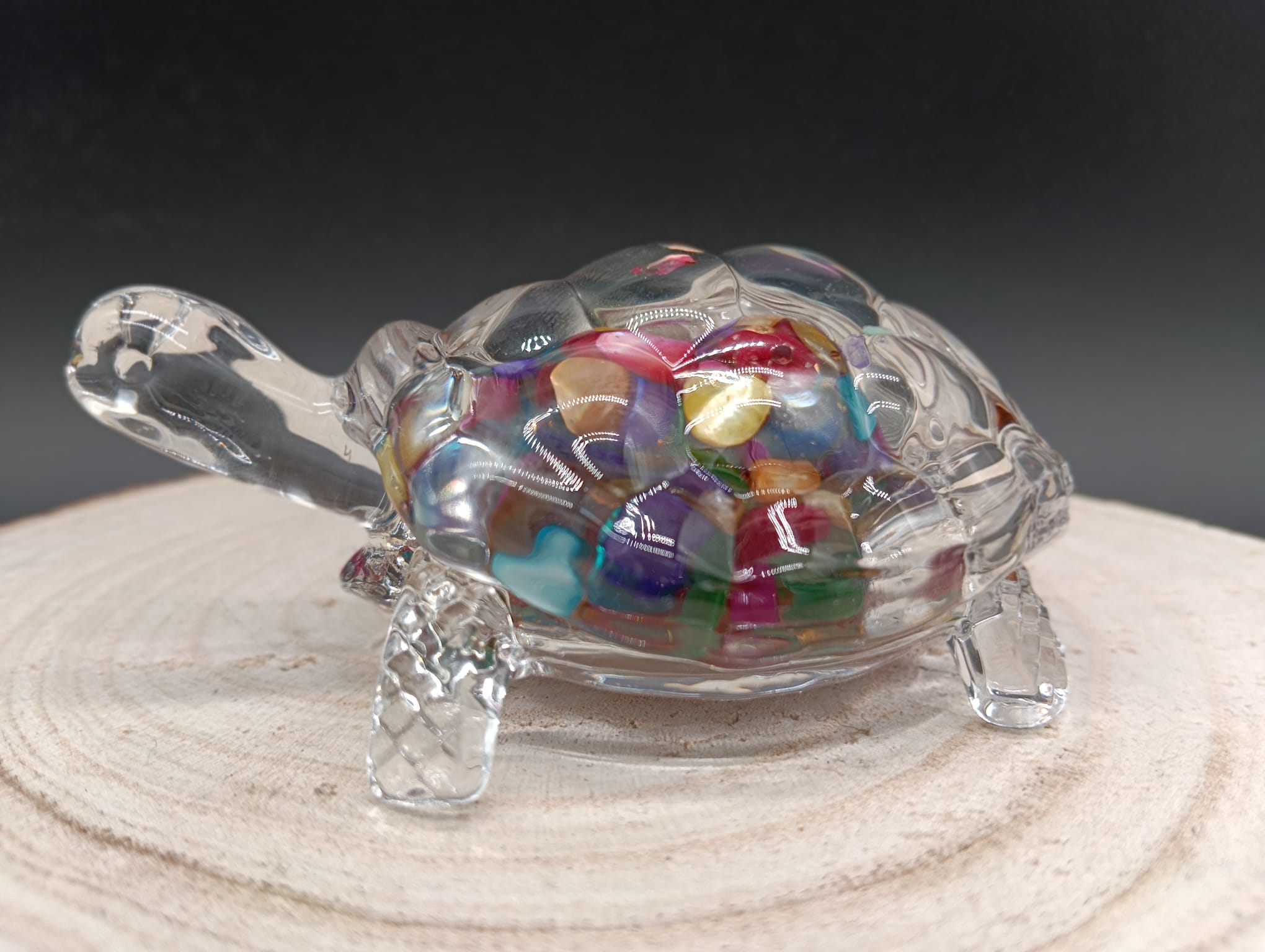 Esta hermosa tortuga de cristal contiene en su interior una cuidada selección de minerales que representan los 7 chakras, acompañados de delicados fragmentos de pan de oro, creando una pieza llena de color, armonía y significado energético.